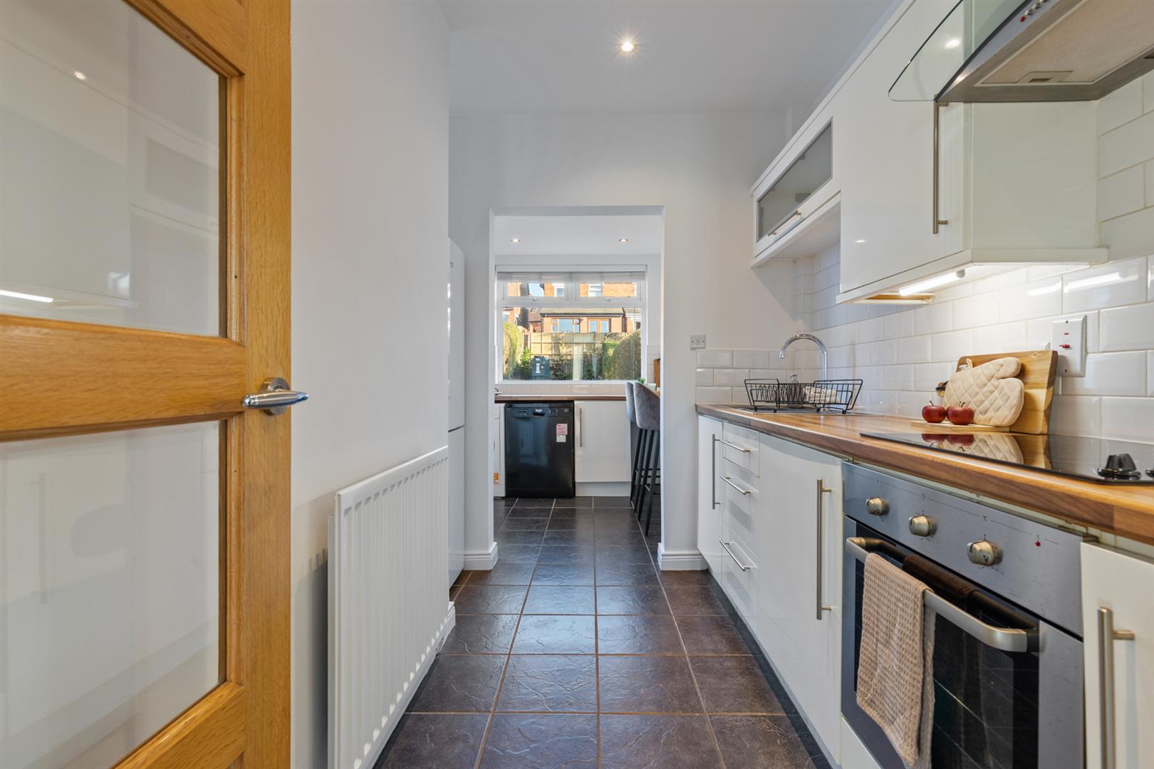 Modern range of high and low level 'white gloss' units, wood laminate work surfaces, inset single drainer stainless steel sink unit with mixer tap, built in under oven, ceramic hob and extractor hood. Part tiled walls, ceramic tiled flooring, recessed spotlighting, archway to: