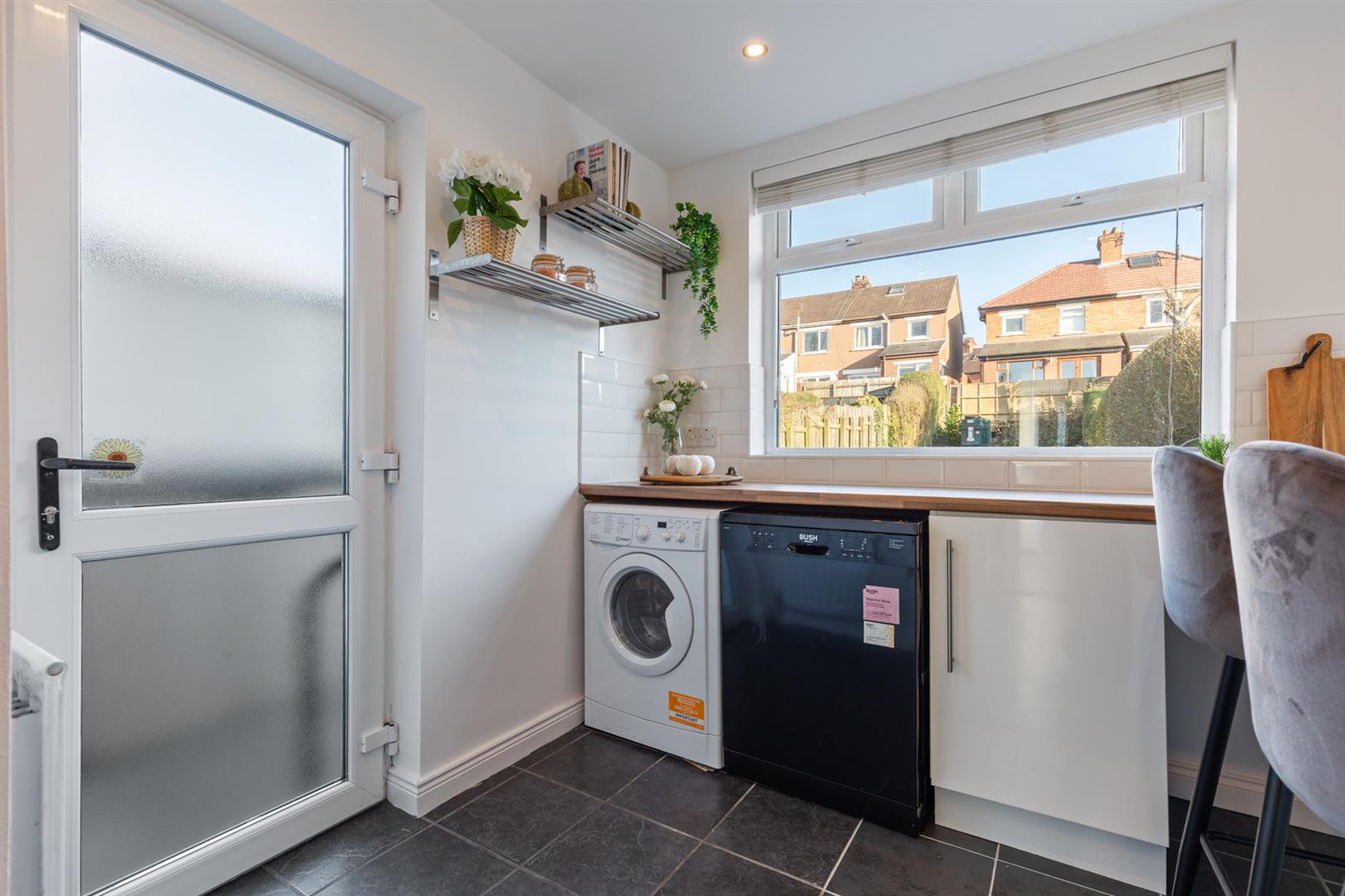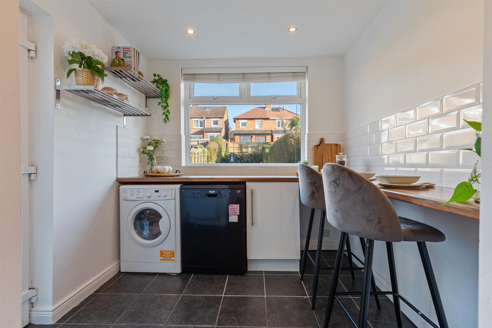 Low level units with wood laminate work surfaces and breakfast bar, plumbed for dishwasher and washing machine, part tiled walls, ceramic tiled flooring, recessed spotlighting.
