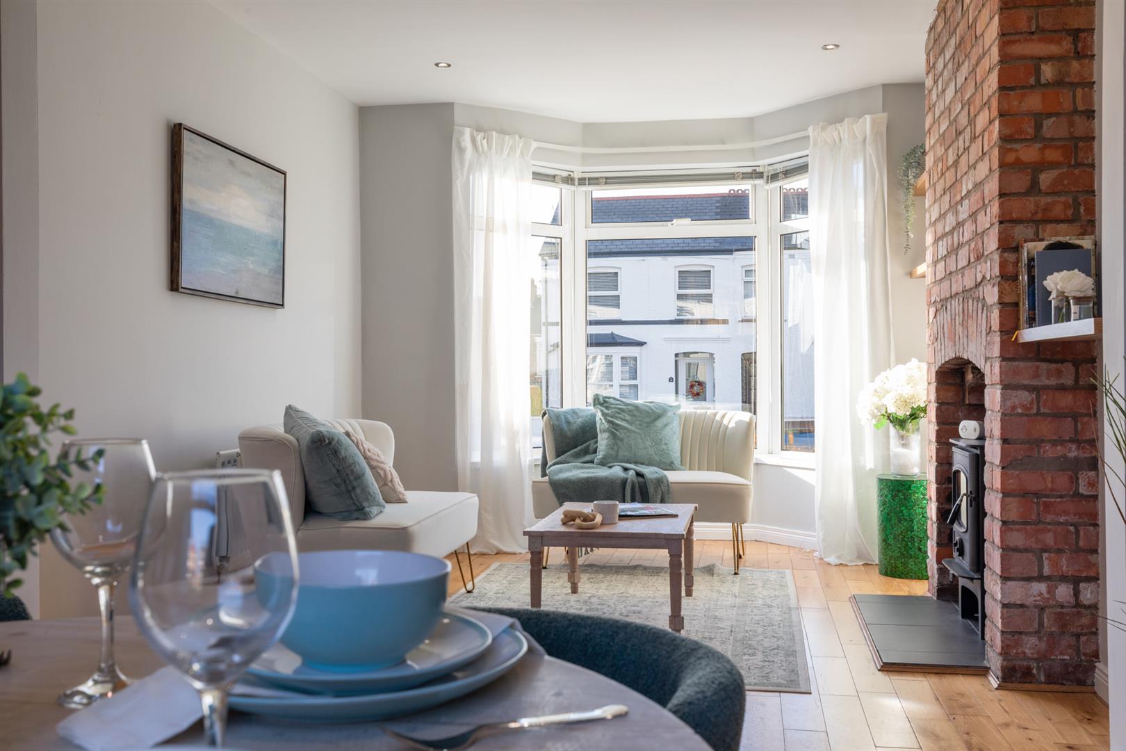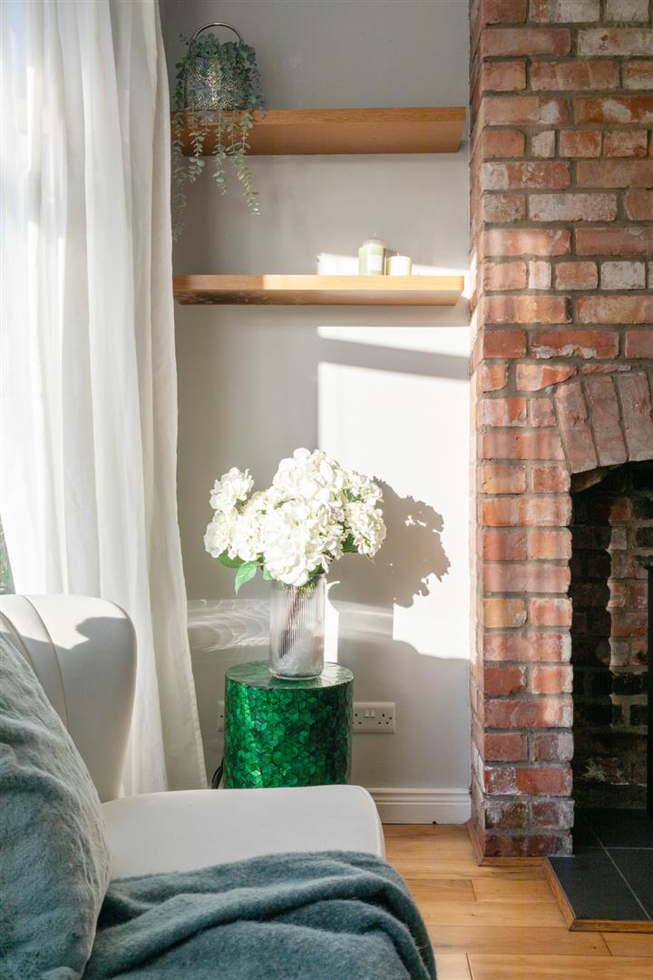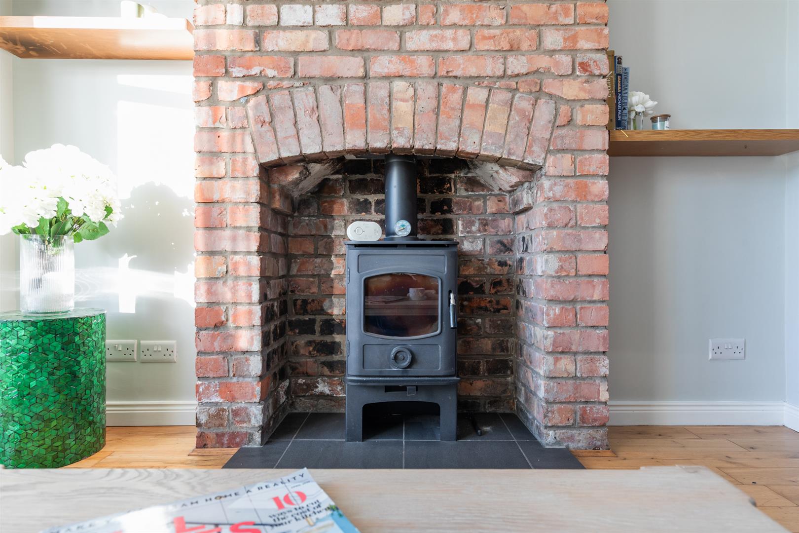 Attractive brick feature fireplace with wood burning stove and tiled hearth, solid oak wood flooring, recessed spotlighting, open to: