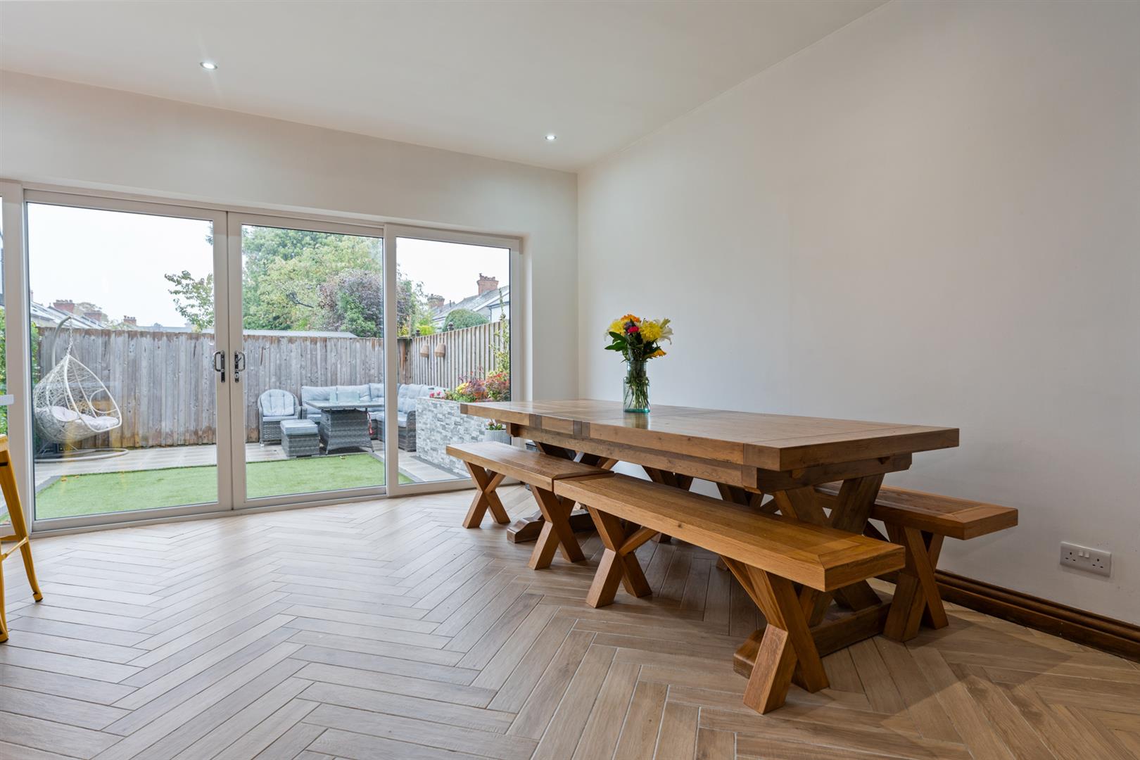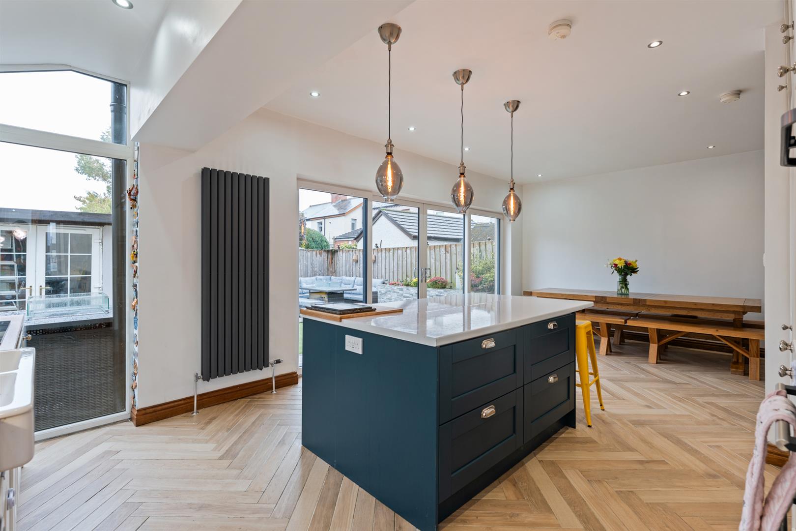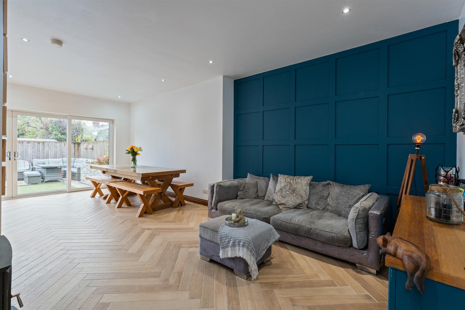 On entry this property will immediately impress with it's attractive period features, starting with the wood effect tiled flooring in a herringbone style, which runs throughout the ground floor. Not to mention the cornice ceilings, feature wood panelled walls and radiators. The accommodation includes good size lounge with bay window, living room including freestanding flueless stove with gas fire, open to a superb family area with dining space, luxury fitted kitchen with feature island, impressive sliding doors to garden, and the added bonus of a separate utility room with matching units, and luxury ground floor toilet suite.