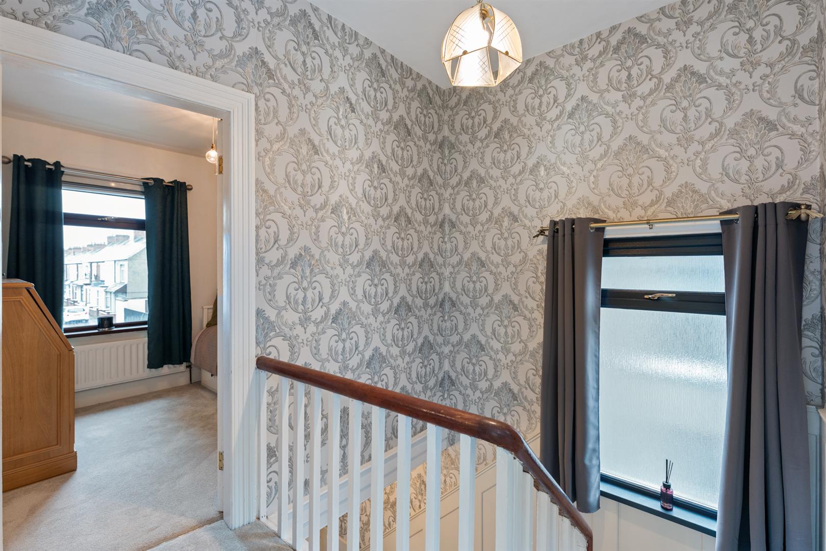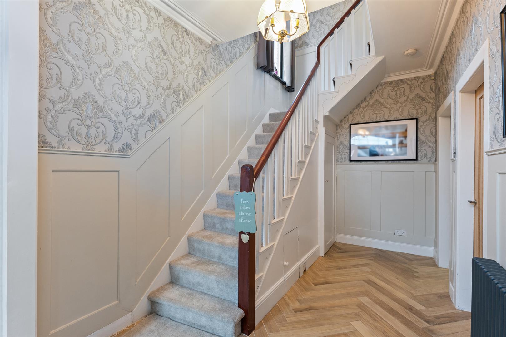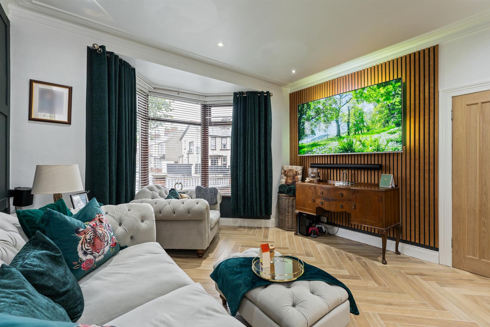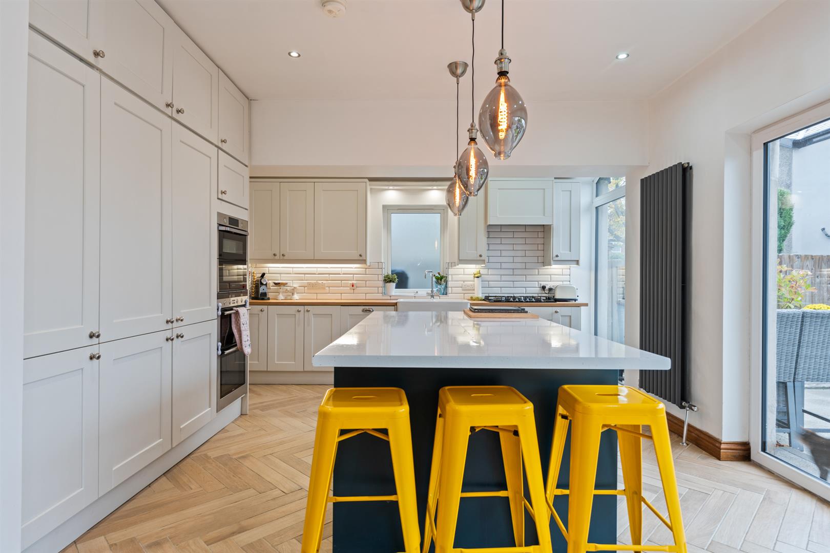 On entry this property will immediately impress with it's attractive period features, starting with the wood effect tiled flooring in a herringbone style, which runs throughout the ground floor. Not to mention the cornice ceilings, feature wood panelled walls and radiators. The accommodation includes good size lounge with bay window, living room including freestanding flueless stove with gas fire, open to a superb family area with dining space, luxury fitted kitchen with feature island, impressive sliding doors to garden, and the added bonus of a separate utility room with matching units, and luxury ground floor toilet suite.