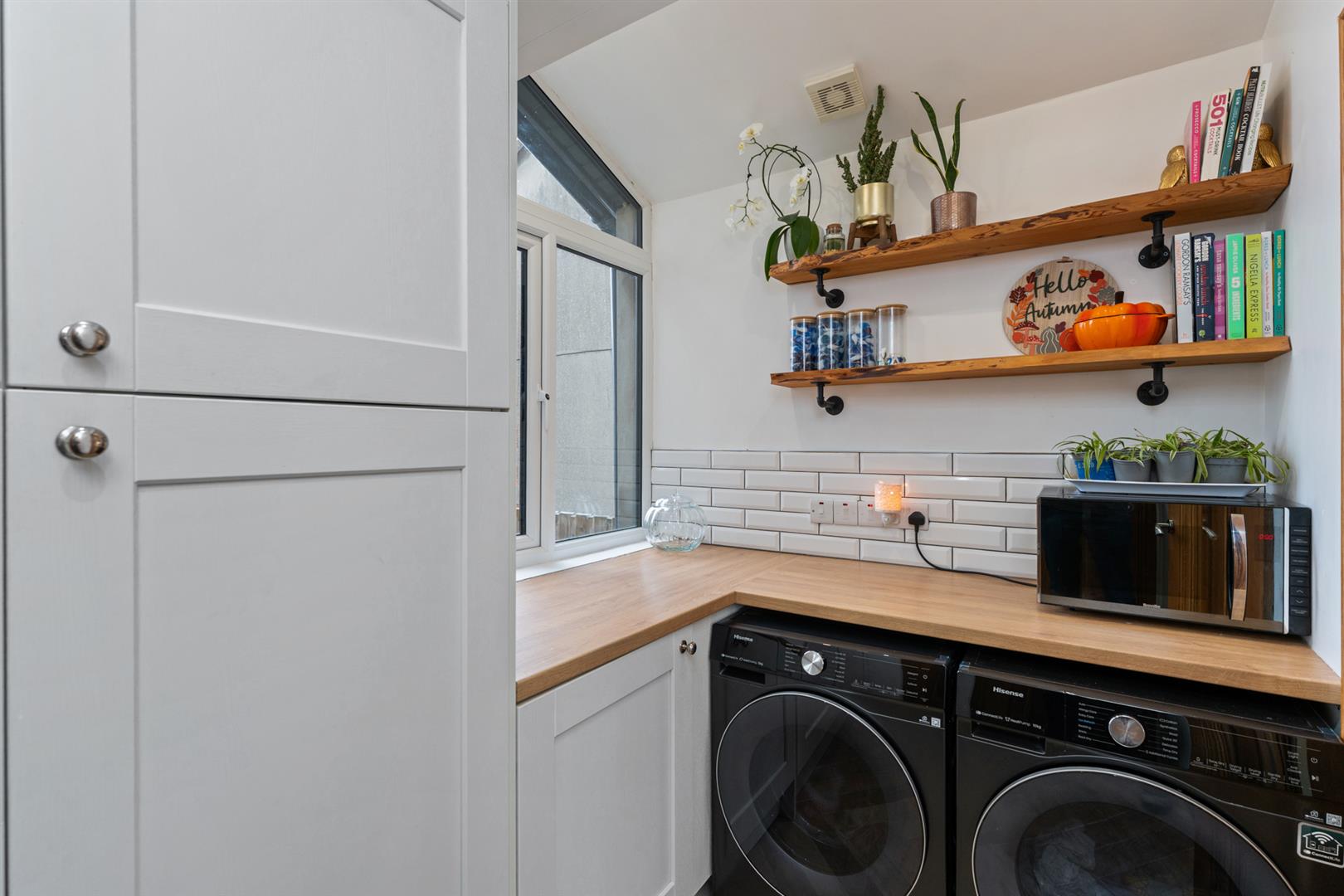Range of matching high and low level units with wood effect work surfaces, plumbed for washing machine, part tiled walls, wood effect tiled flooring in herringbone style, recessed spotlighting.