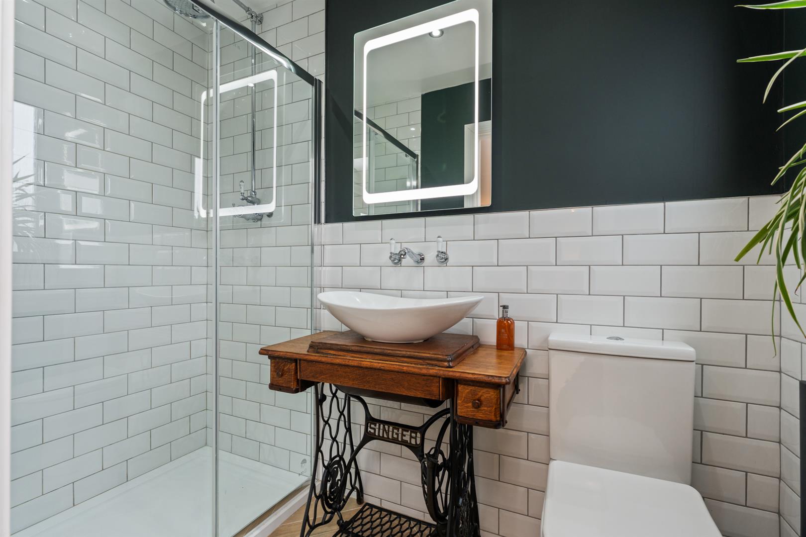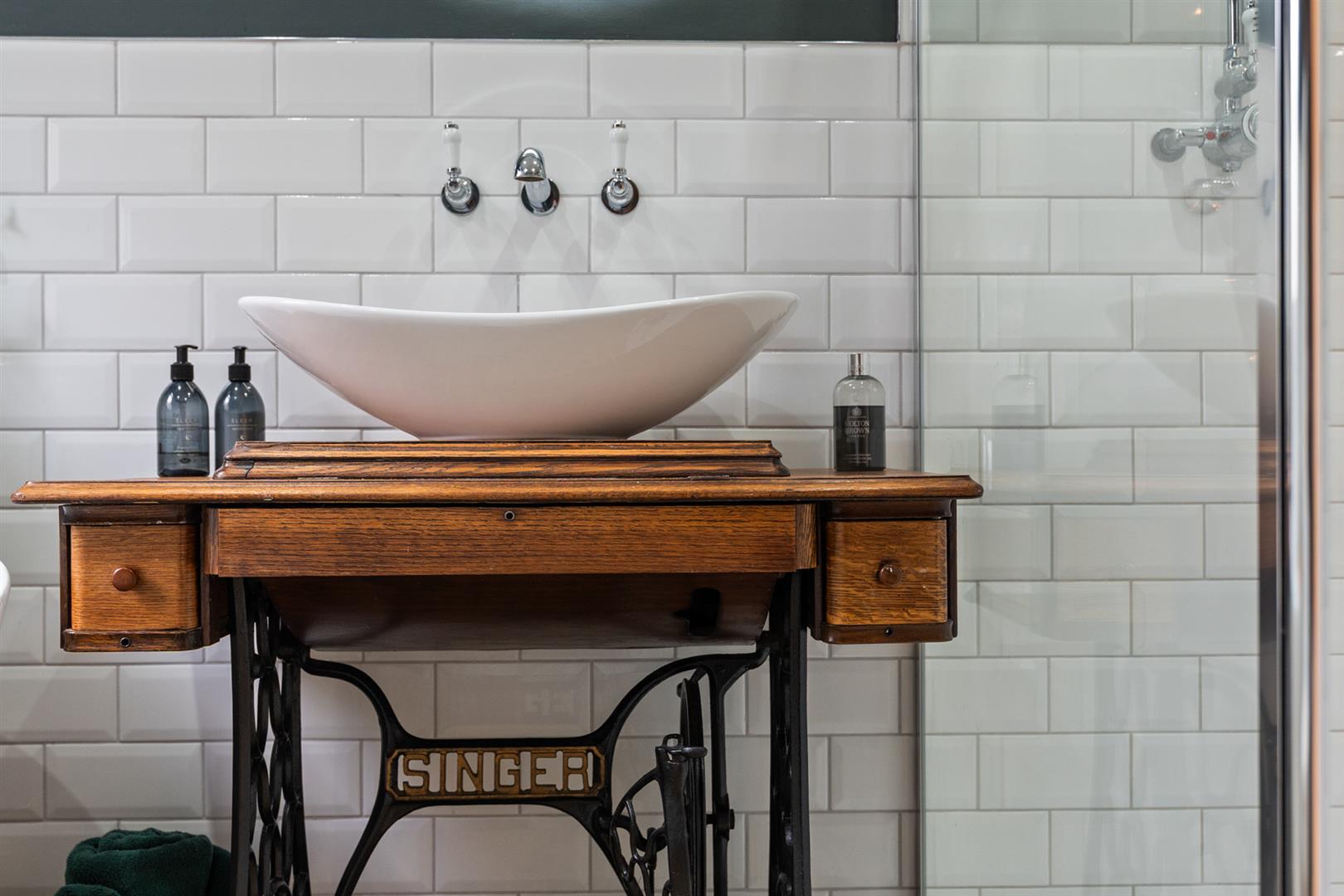 Luxury white suite comprising: Built in shower cubicle with built in rainfall shower, tiled walls and sliding shower door. Rustic wooden and cast iron 'Singer' sewing machine base vanity unit with built in mixer taps. Low flush WC, partly tiled walls, wood effect tiled flooring in herringbone style, recessed spotlighting.