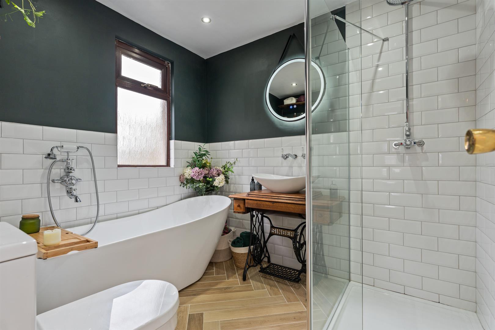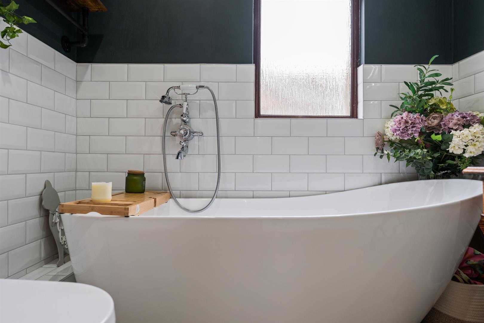 Luxury white suite comprising: Freestanding feature bath with built in mixer taps and telephone hand shower. Large walk in shower cubicle with built in rainfall shower and shower screen. Rustic wooden and cast iron 'Singer' sewing machine base vanity unit with built in mixer taps, low flush WC. Half tiled walls, wood effect tiled flooring in herringbone style, recessed spotlighting, extractor fan.