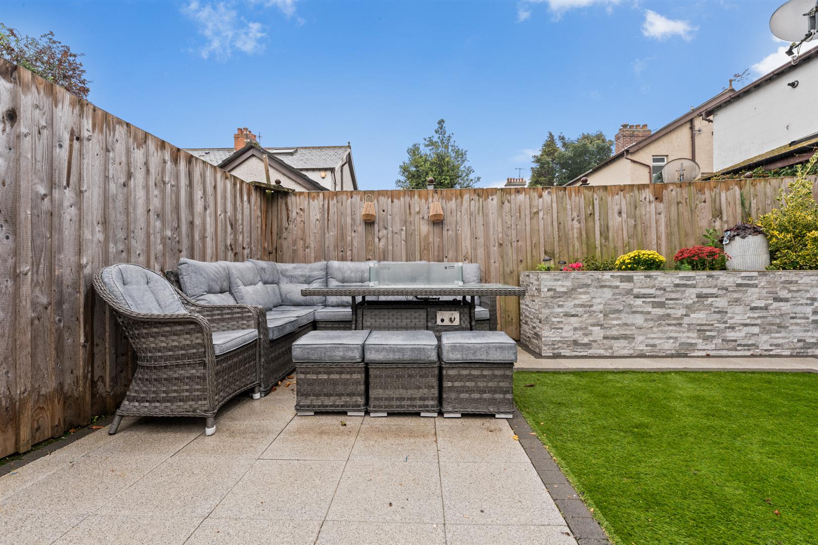 Front garden with lawn, gated driveway and boundary wall. Enclosed rear garden with feature patio and inset artificial grass area, raised flower beds finished with feature stone cladding.