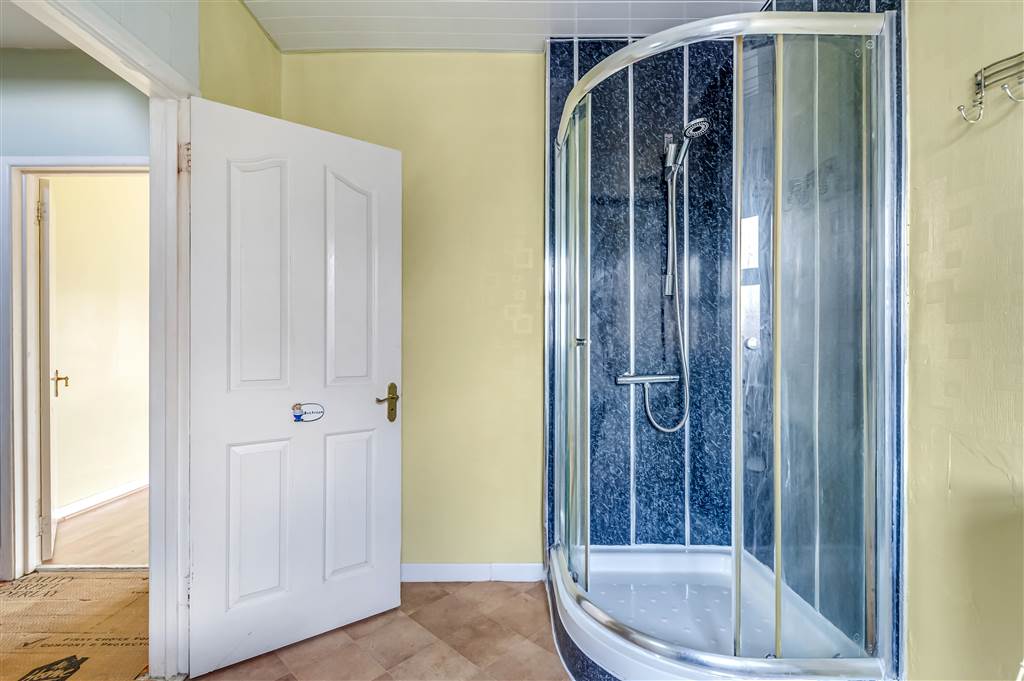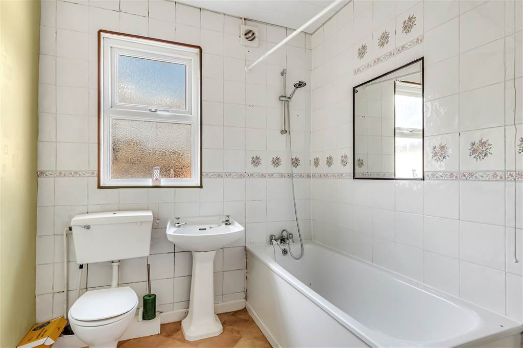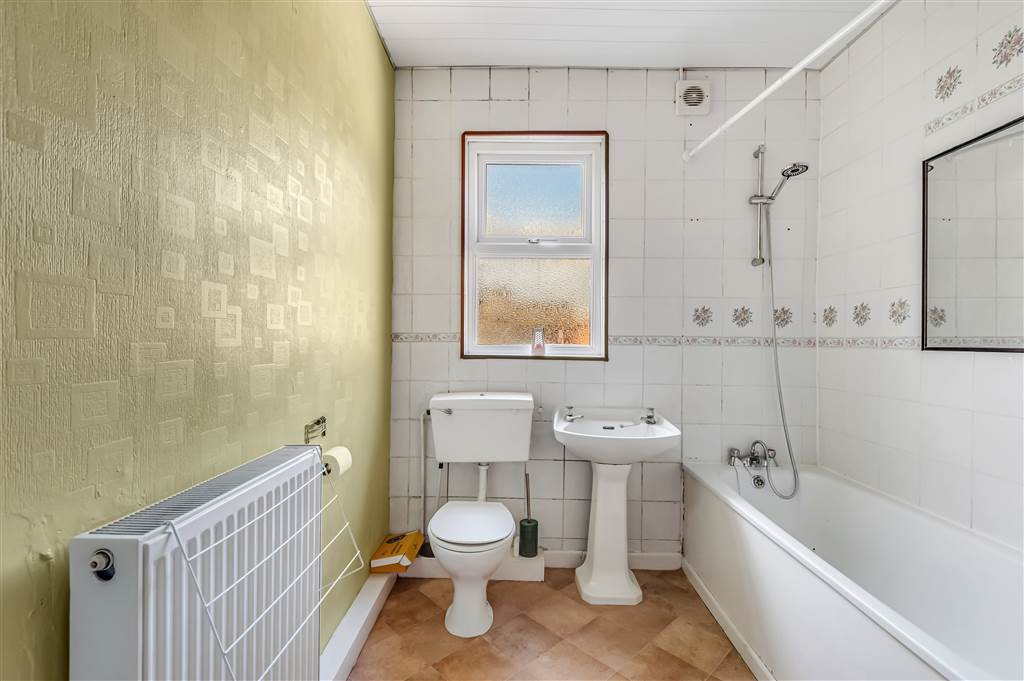 White suite comprising of panelled bath with bath/shower mixer taps, low flush W.C, pedestal wash hand basin, shower enclosure, double panelled radiator, partly tiled walls, extractor fan.