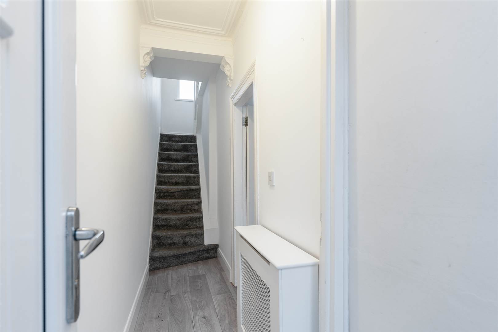 Laminate flooring in a limed oak colour. Staircase to first floor.