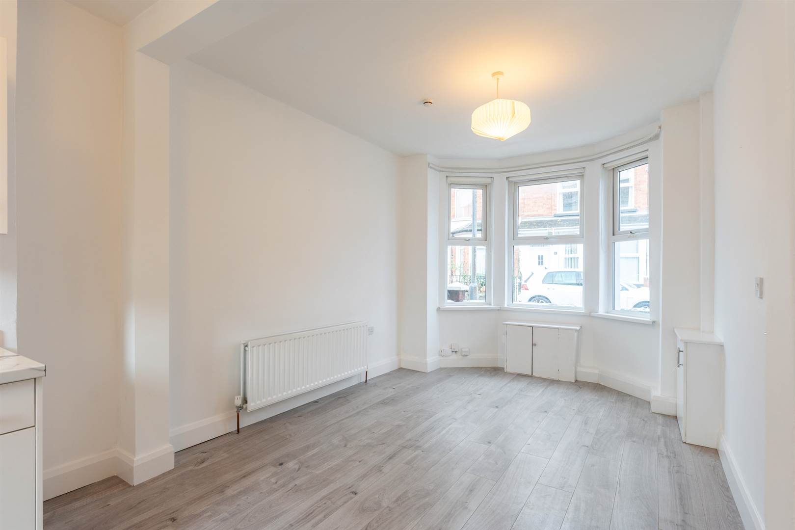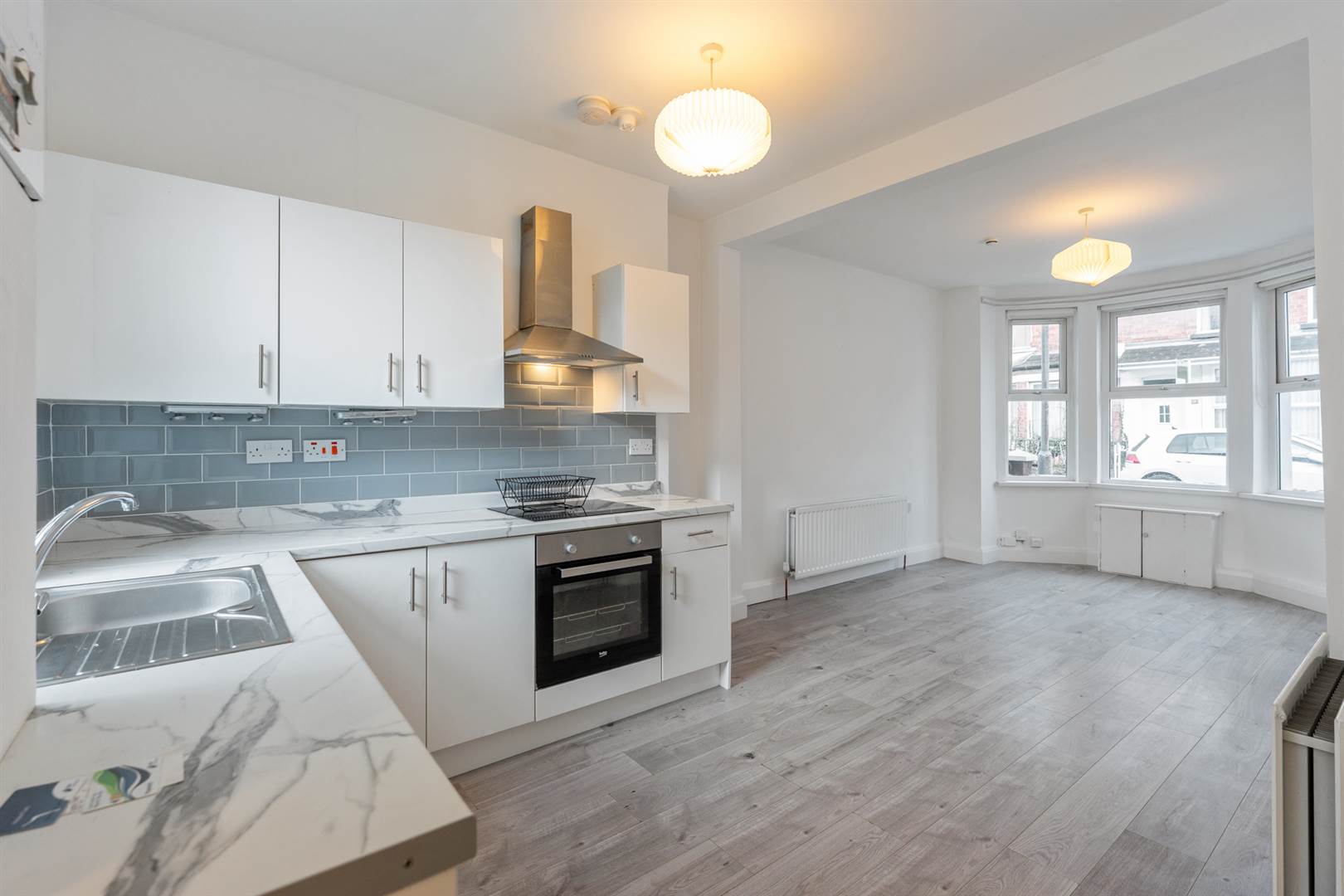 Living room with feature bay window open to a modern white kitchen, integrated appliances and marble effect worktop