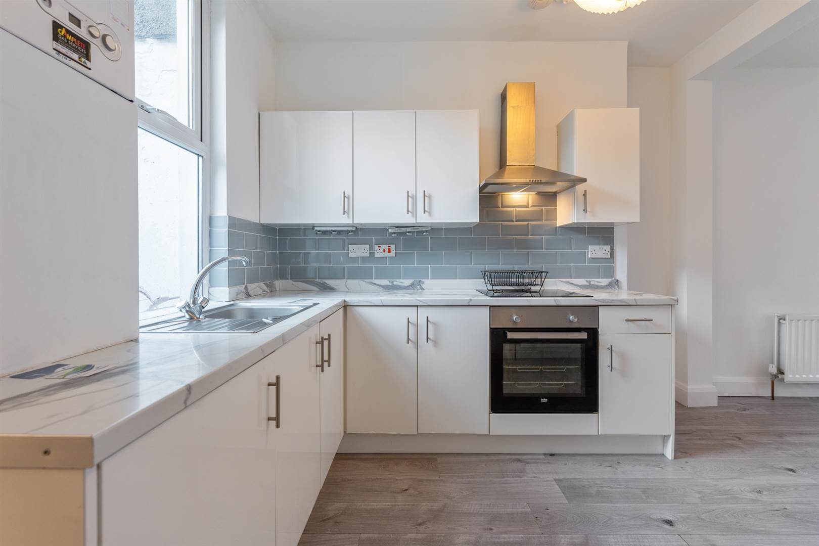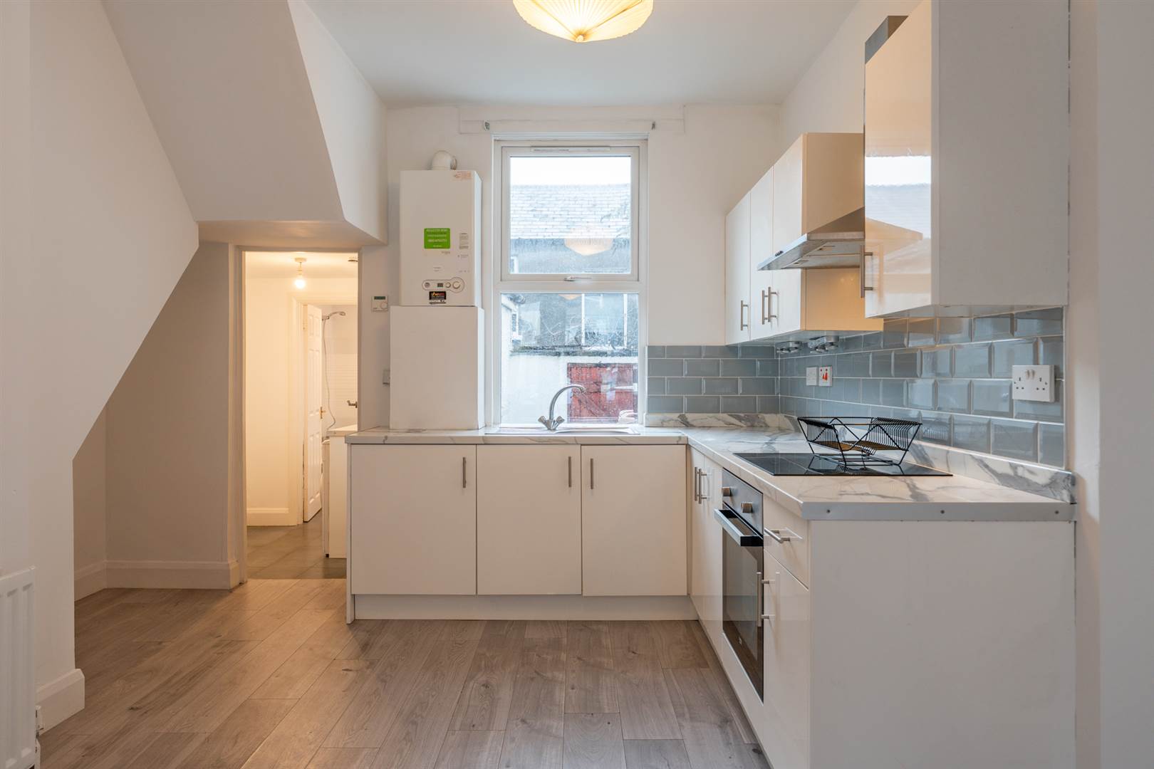 Range of high and low level white high gloss cupboards, marble effect worktops, four ring ceramic hob, stainless steel extractor above, under oven, single drainer stainless steel sink unit with mixer tap, Vokera gas combi boiler, limed oak laminate floor, under stair storage.