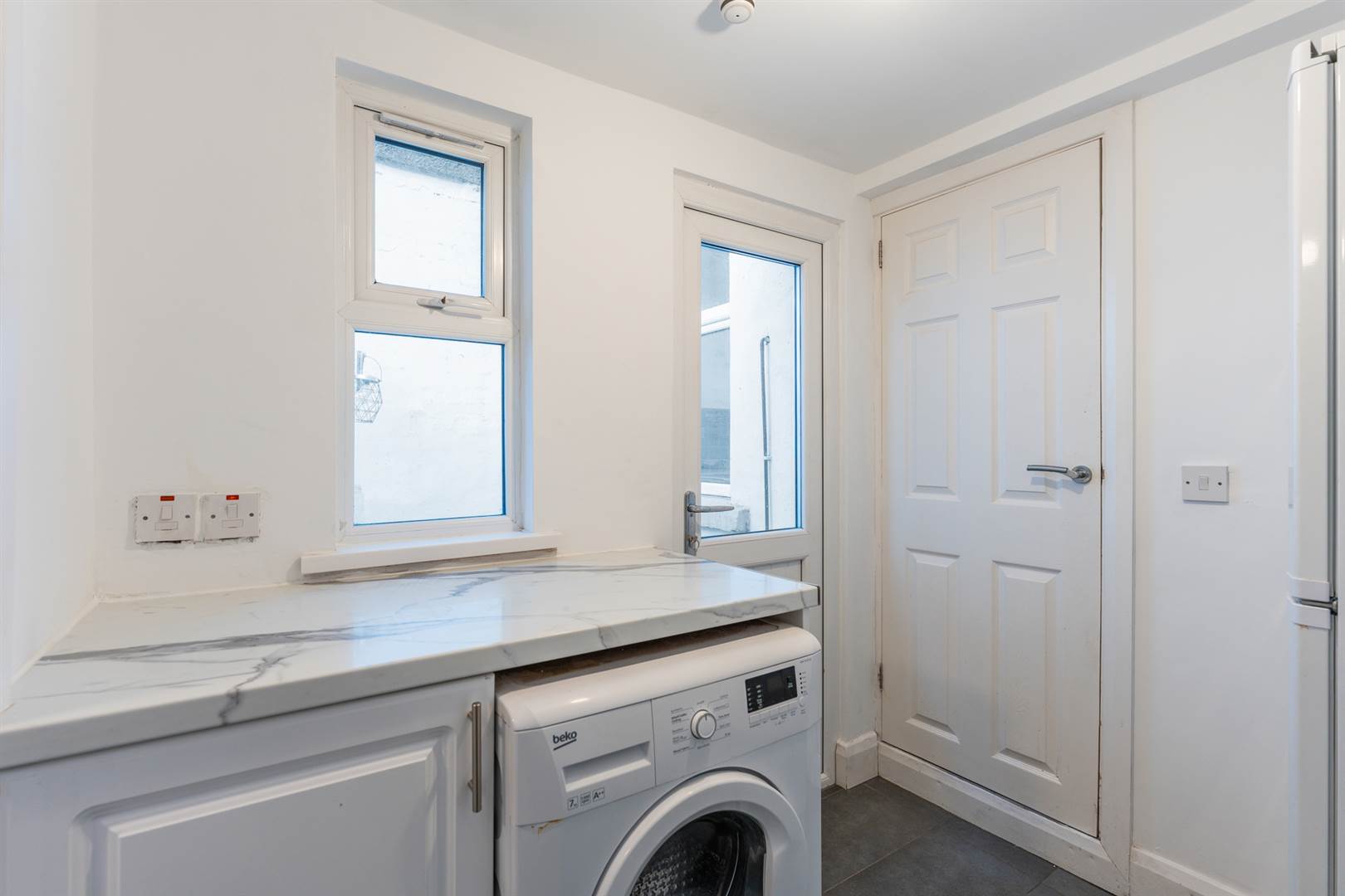 Low level cupboards, plumbed for washing machine, ceramic tiled floor, PVC double glazed service door to rear.