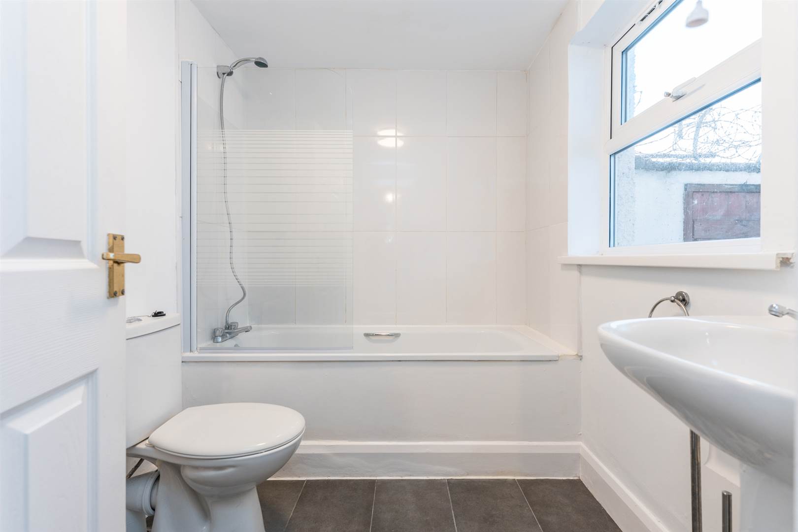White suite comprising panelled bath with mixer tap and shower screen, low flush wc, pedestal wash hand basin, part tiled walls, extractor fan.