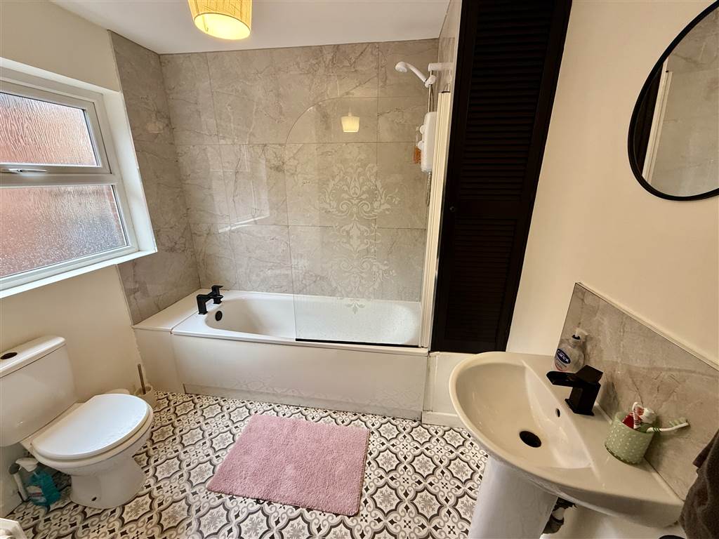 White suite, panelled bath with mixer taps, electric shower unit, tiled splash back, pedestal wash hand basin with mixer taps and tile splash, dual flush close coupled WC, airing cupboard