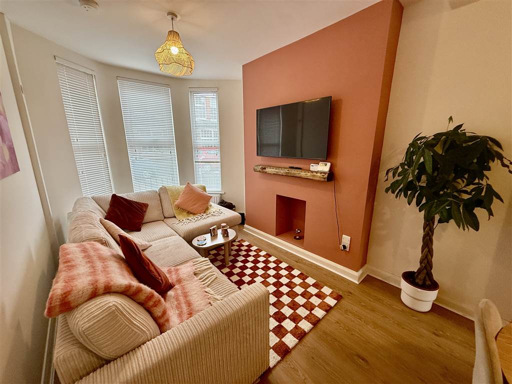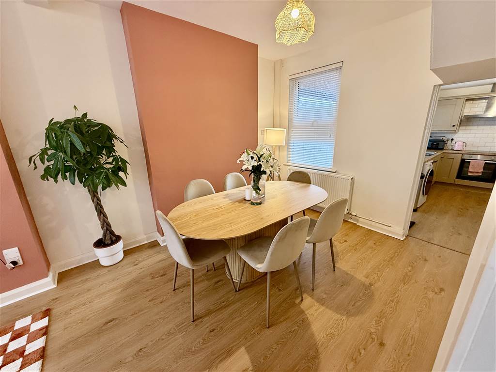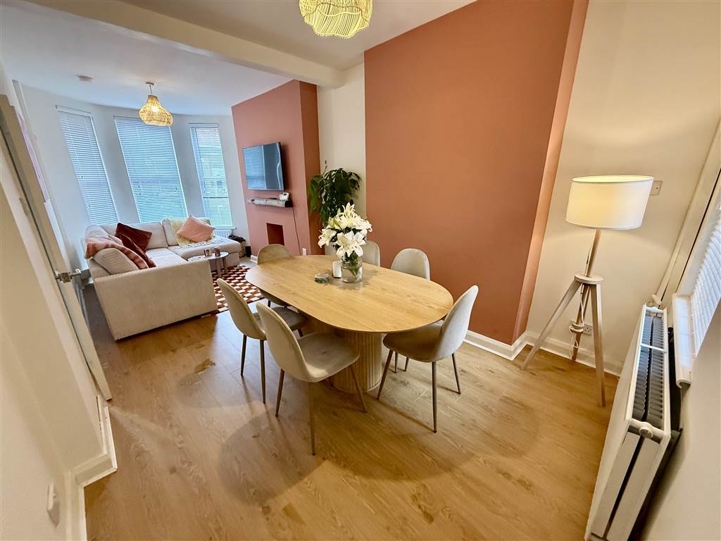 Hole in wall fireplace, laminate wooden floor, bay window, ample dining area, under stairs storage.