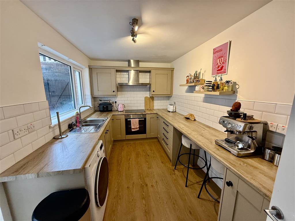 Single drainer stainless steel sink unit with mixer taps, excellent range of high and low level units, brick effect tiled splash back, ceramic tiled floor, plumbed for washing machine, stainless steel built in oven and four ring ceramic hob, stainless steel chimney extractor fan, integrated fridge freezer, breakfast bar.