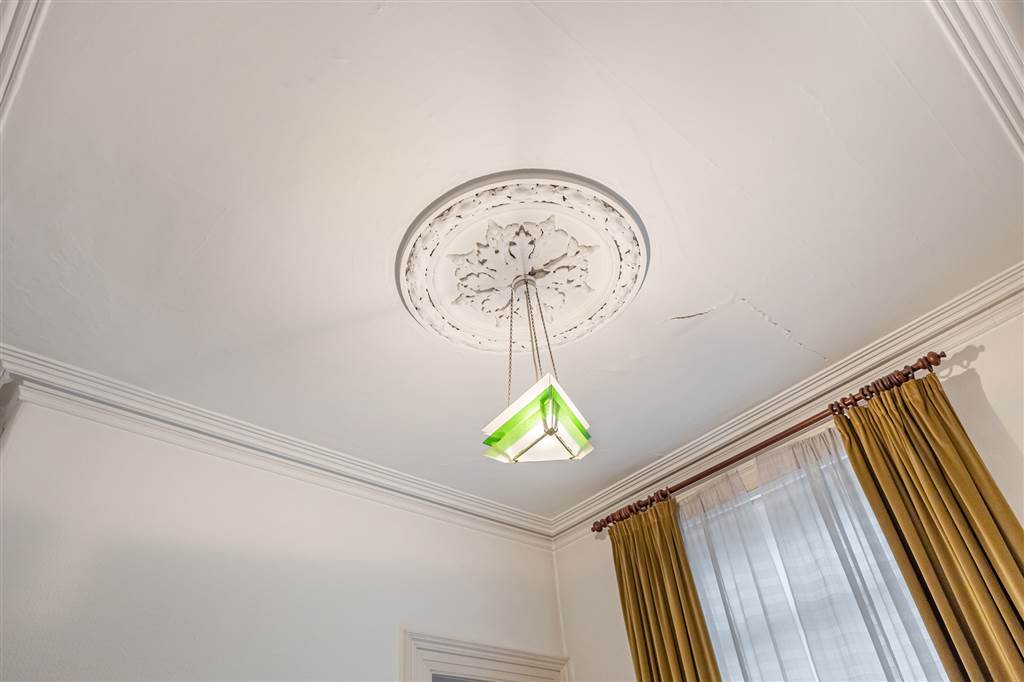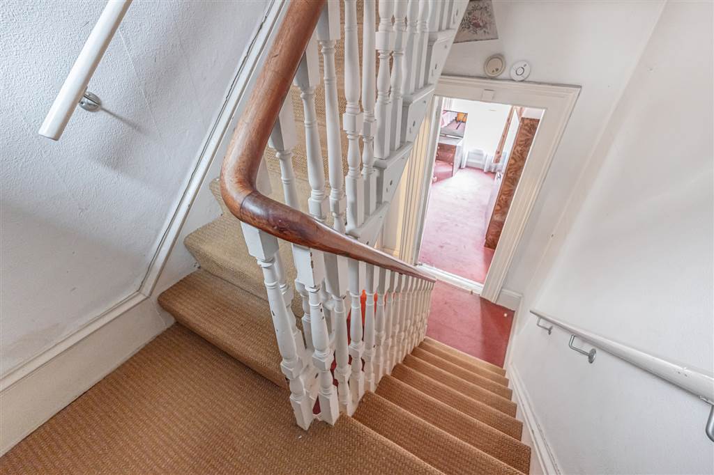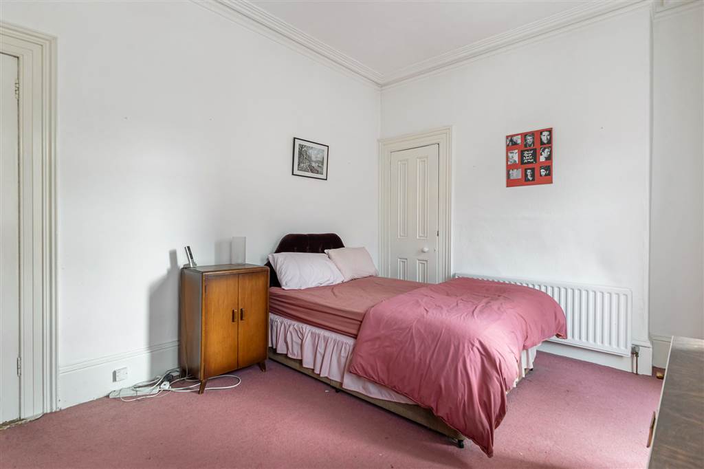 Carpeted flooring, ceiling cornicing, ceiling rose and built-in storage.