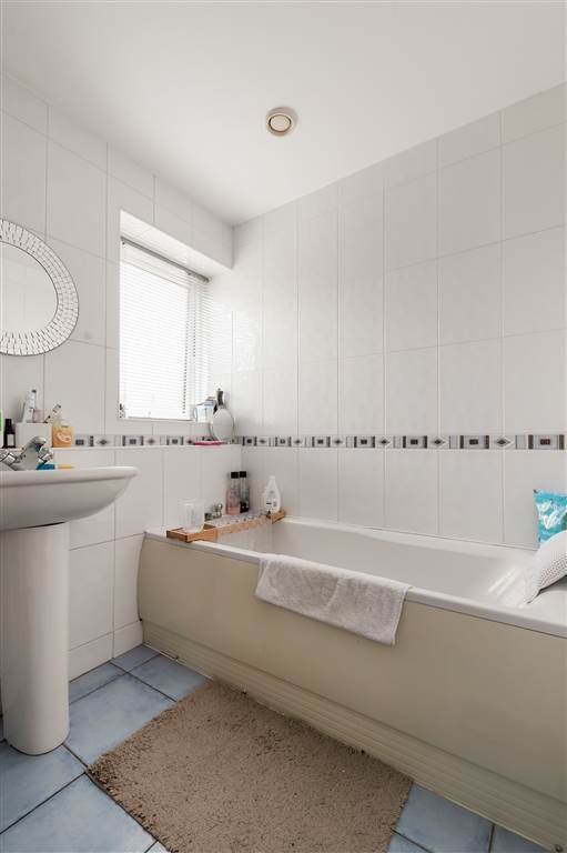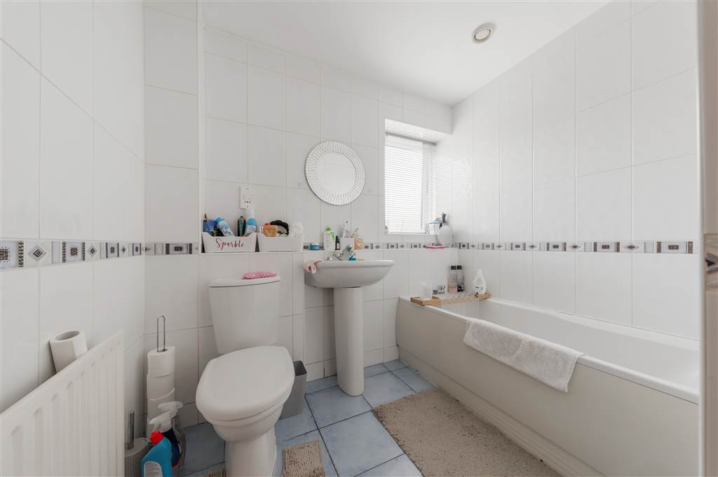 White suite comprising of panelled bath, low flush w.c, pedestal wash hand basin, extractor fan, fully tiled walls, ceramic tile flooring, panelled radiator.
