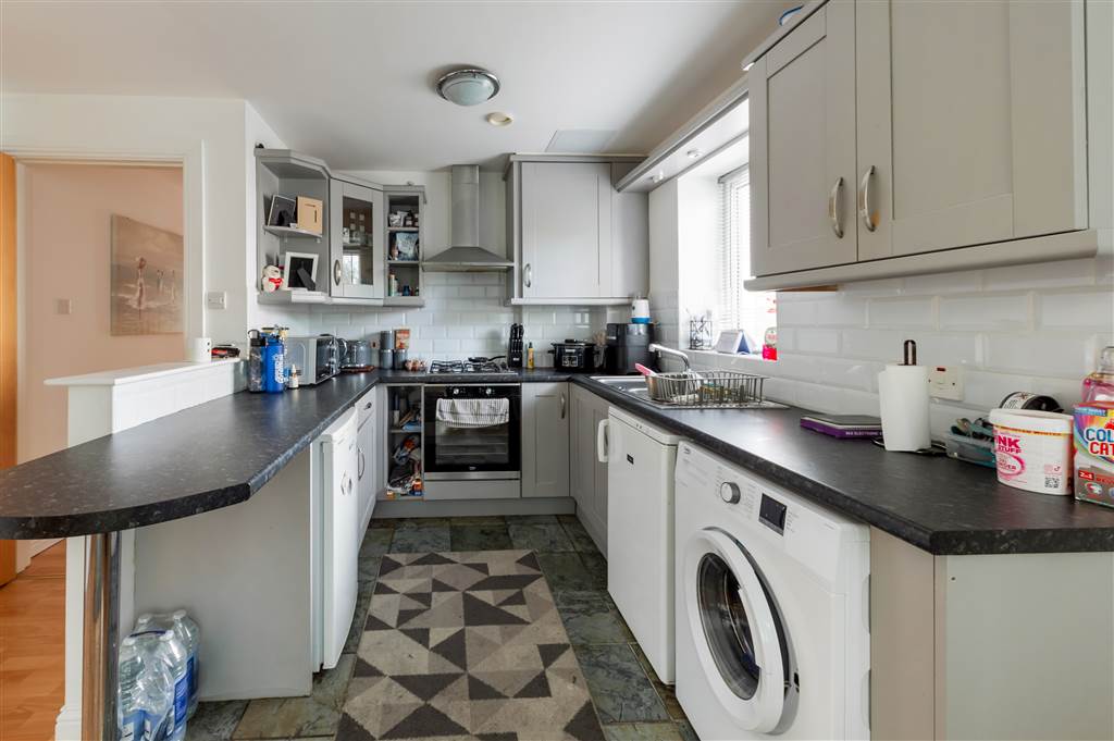 Good range of high and low level units, 4 ring gas hob & integrated electric oven, stainless steel extractor fan, stainless steel sink unit with mixer taps, plumbed for washing machine, under counter fridge freezer, partly tiled walls, ceramic tile flooring.