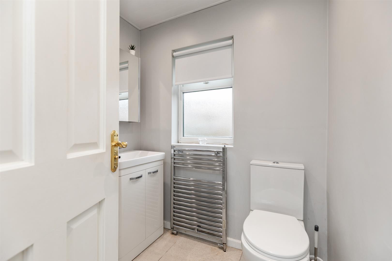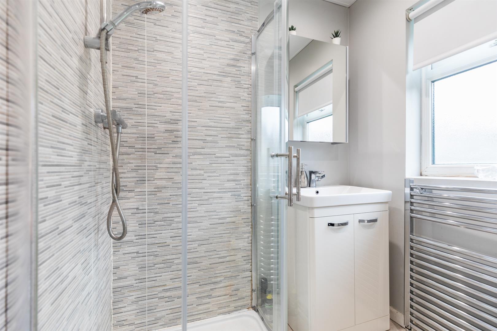 White suite comprising: Vanity unit with mixer taps, low flush WC, shower cubicle with built in shower and sliding shower doors, part tiled walls, fully tiled floor, wall mounted feature chrome radiator.