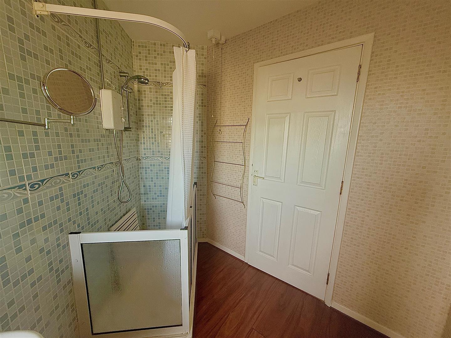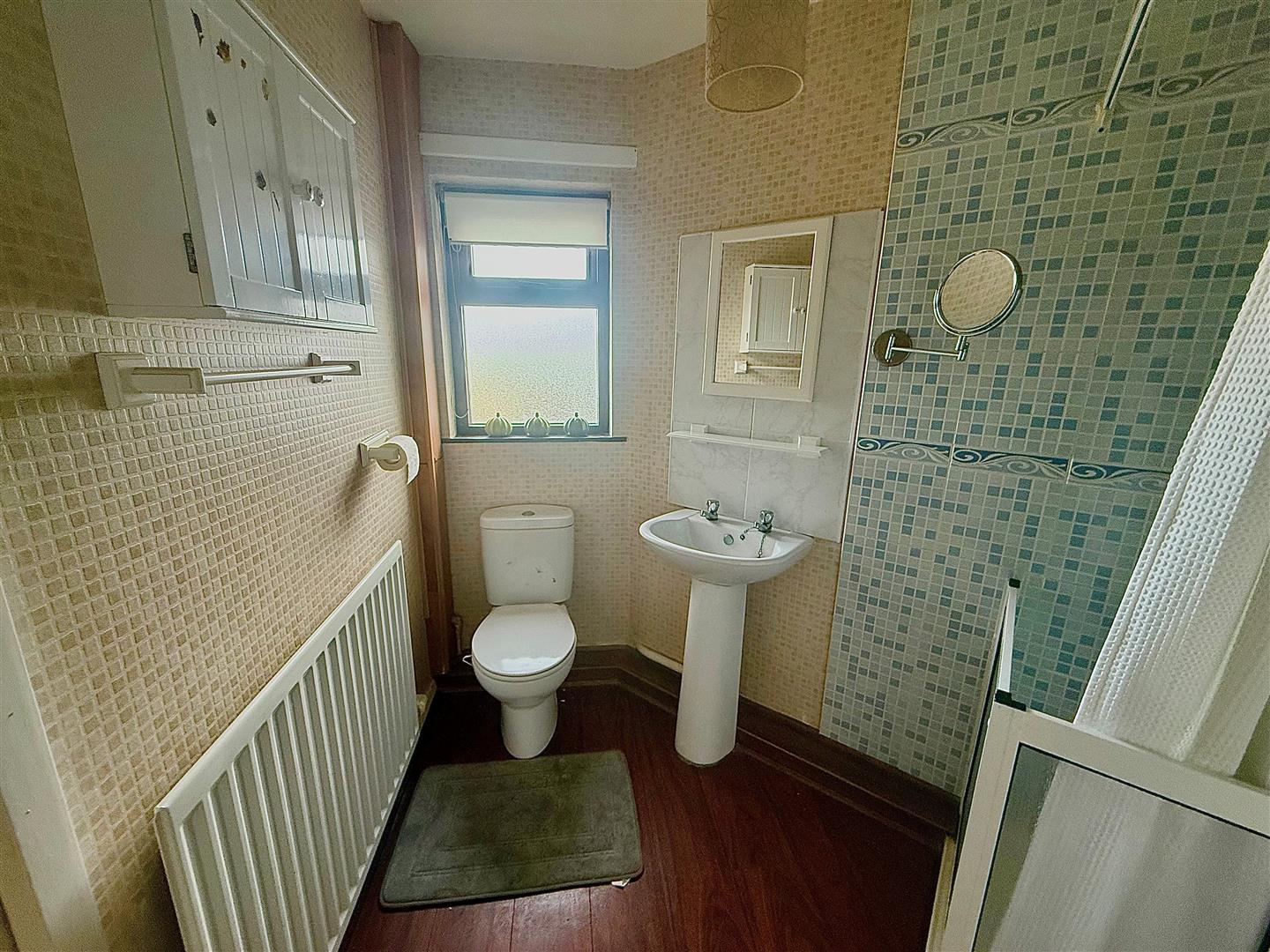 White suite comprising walk-in shower area with electric shower and tiled splashback, pedestal wash hand basin with tiled splashback, and low flush WC. Wood laminate flooring.