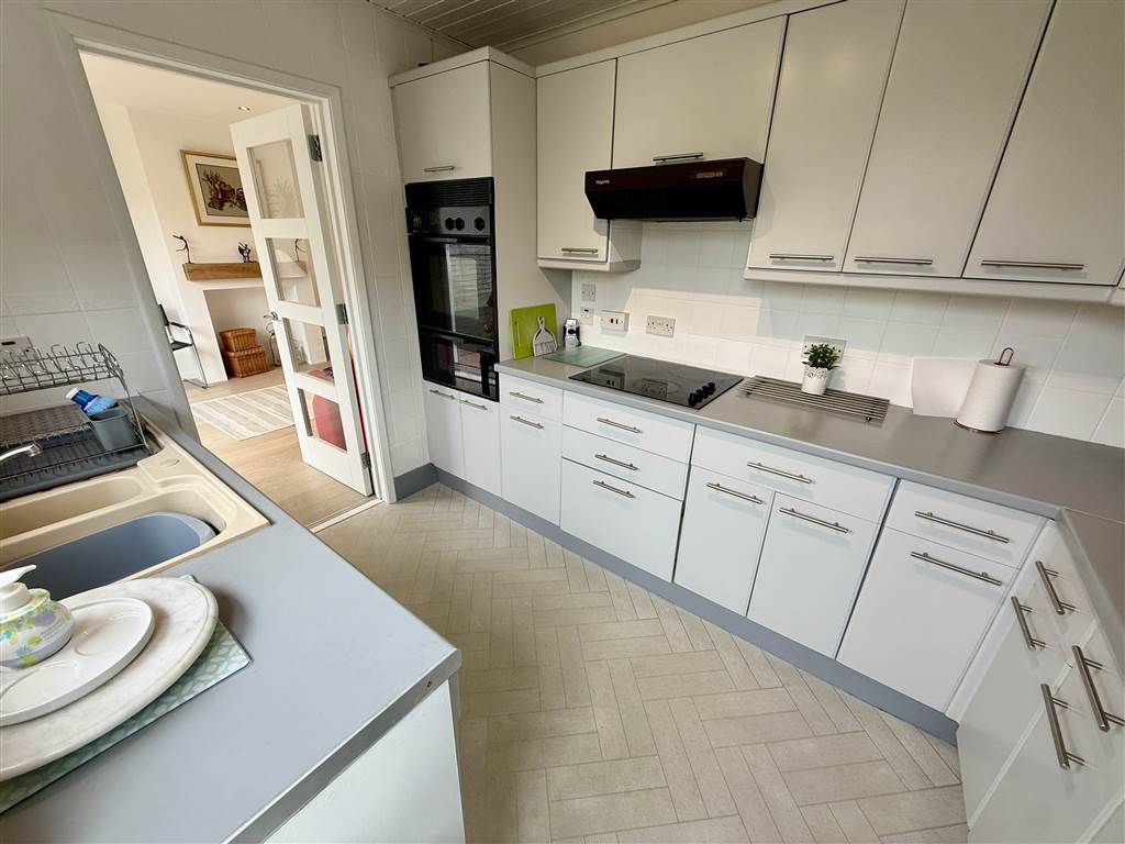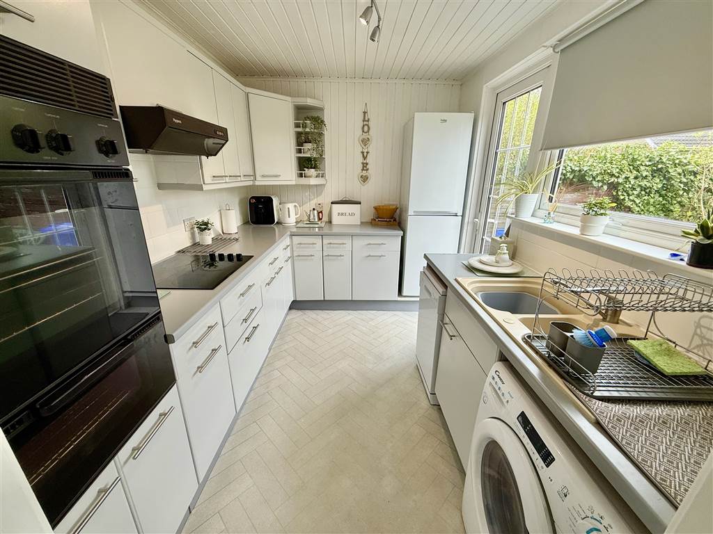 Range of high and low level units with laminate worktops. 1 1/2 sink with drainer. Built in electric hob and double oven. Plumbed for washing machine. Access to rear.
