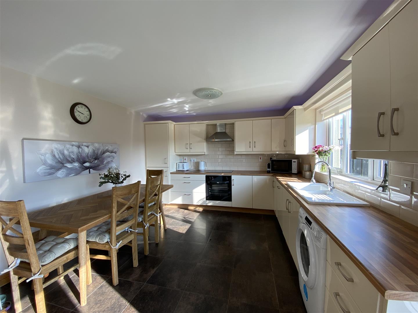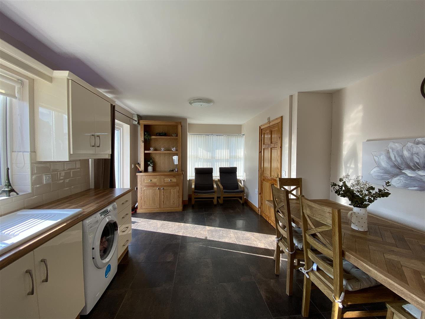Having range of eye and low level units with concealed lighting under, tiling between units, matching pelmet over window, 1 1/2 bowl stainless steel sink unit, hob, underoven, plumbed for washing machine and dishwasher, integrated fridge / freezer, tiled floor, ample dining space.
