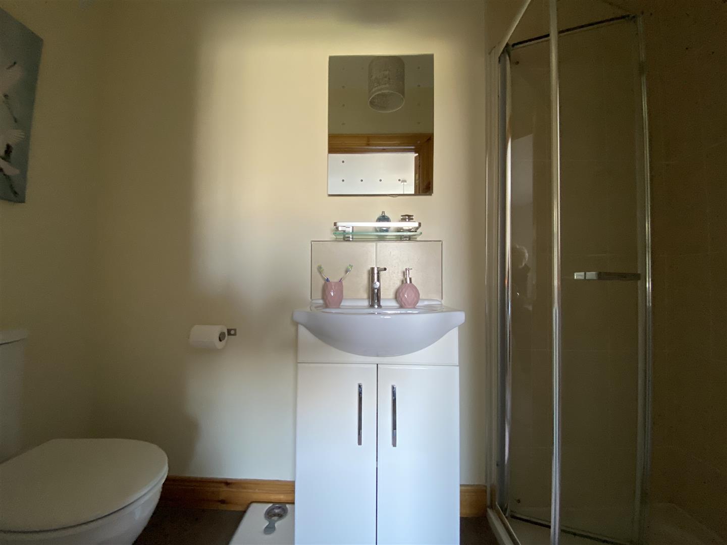 Comprising fully tiled walk in power shower, whb set in vanity unit, wc.