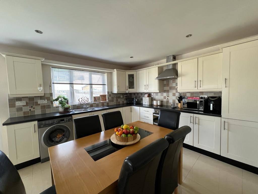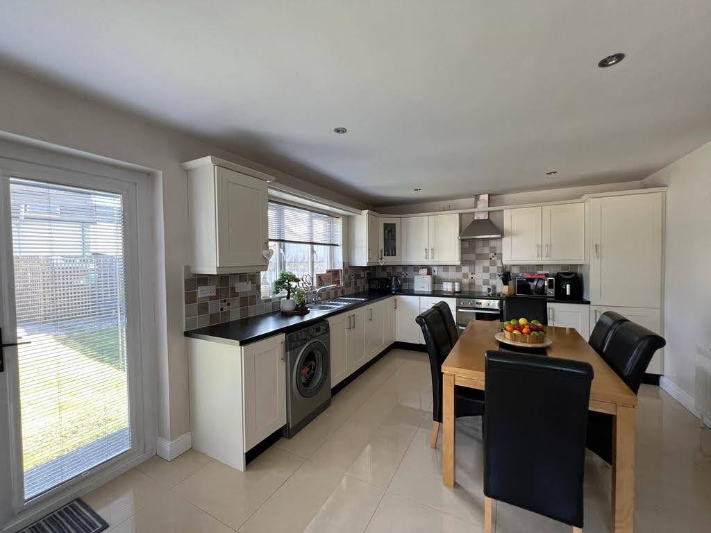 Having range of eye and low level units, tiling between units, hob, double oven, stainless steel extractor hood, integrated fridge / freezer, plumbed for washing machine, ample dining space, storage cupboard, recessed lighting, French doors leading to rear, tiled floor.
