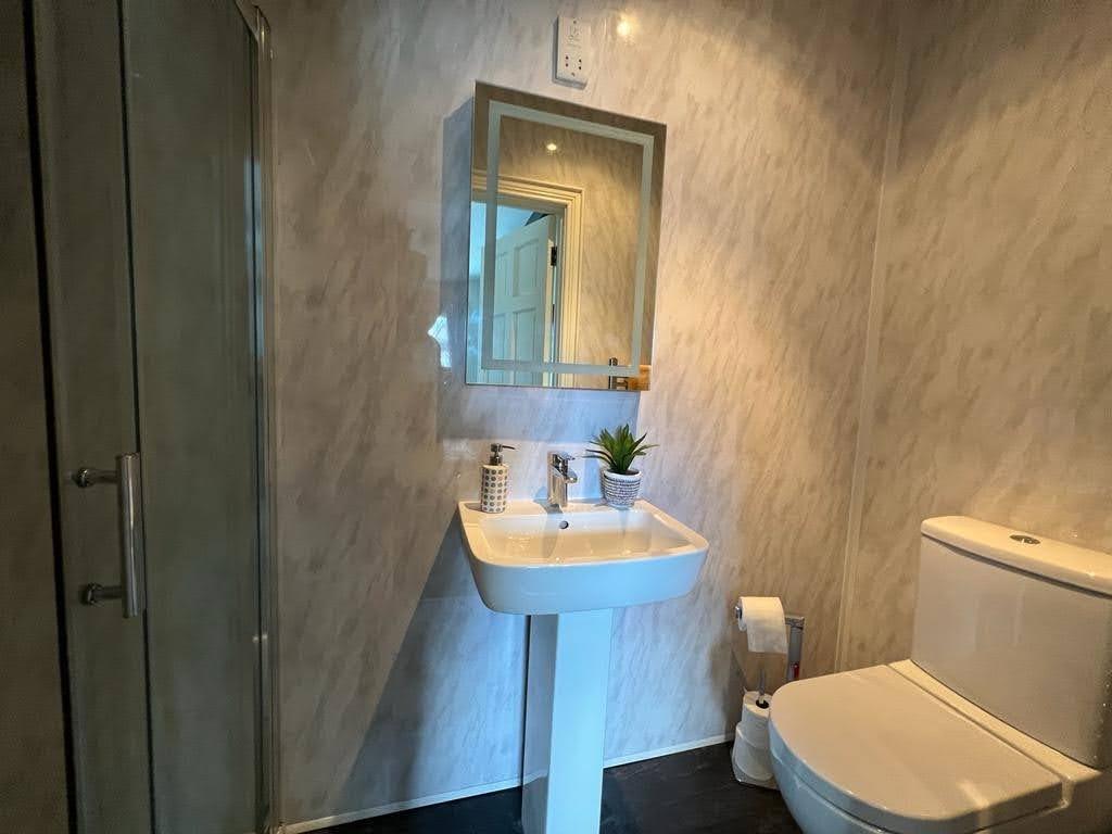Comprising walk in electric shower, whb and wc, PVC cladding to walls, recessed lighting, tiled floor.