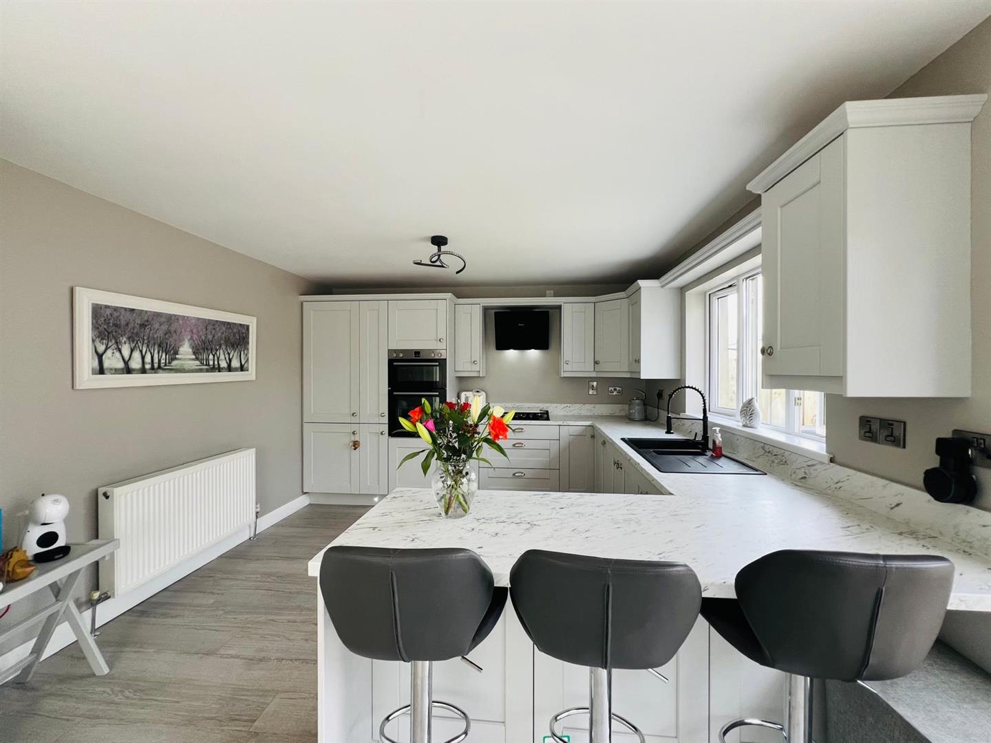 Having excellent range of eye and low level units, 1 1/2 bowl sink unit with mixer taps, gas hob, double oven, integrated fridge / freezer and dishwasher, black extractor hood, breakfast bar, larder cupboard, laminated wooden floor.