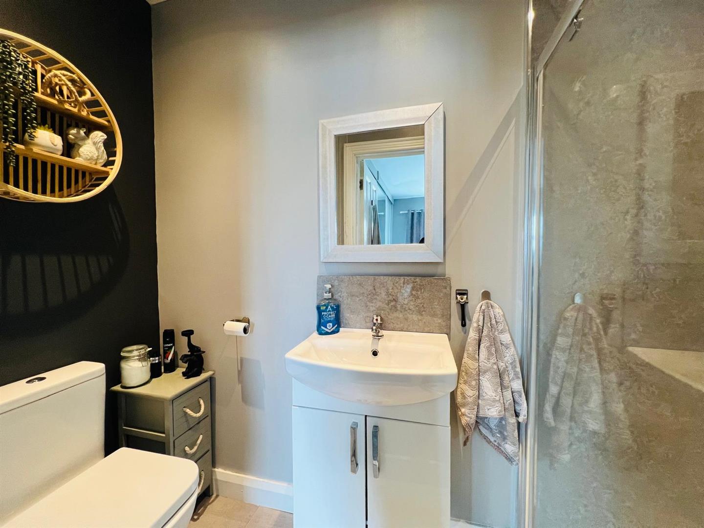 Comprising walk in electric shower with PVC cladding to walls, whb set in vanity unit, wc, laminated wooden floor.