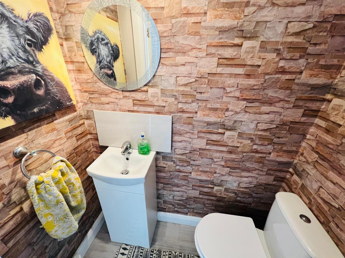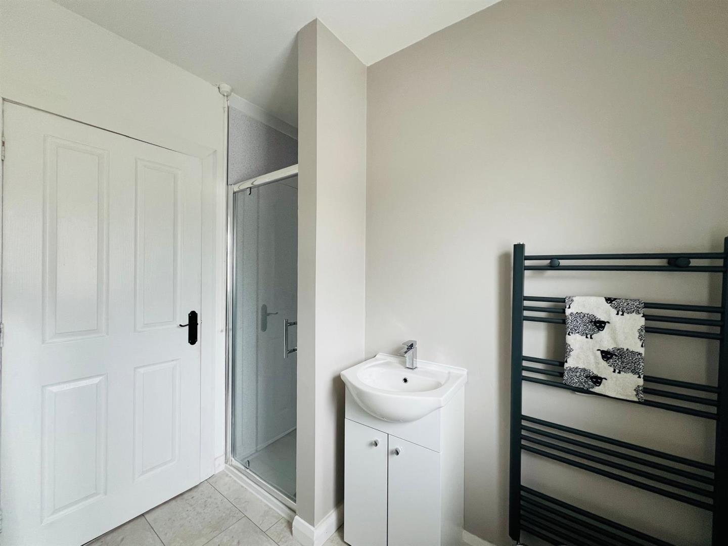 Comprising bath with telephone hand shower attachment to taps, whb and wc, walk in shower with PVC cladding to walls, feature wall radiator, laminated wooden floor.