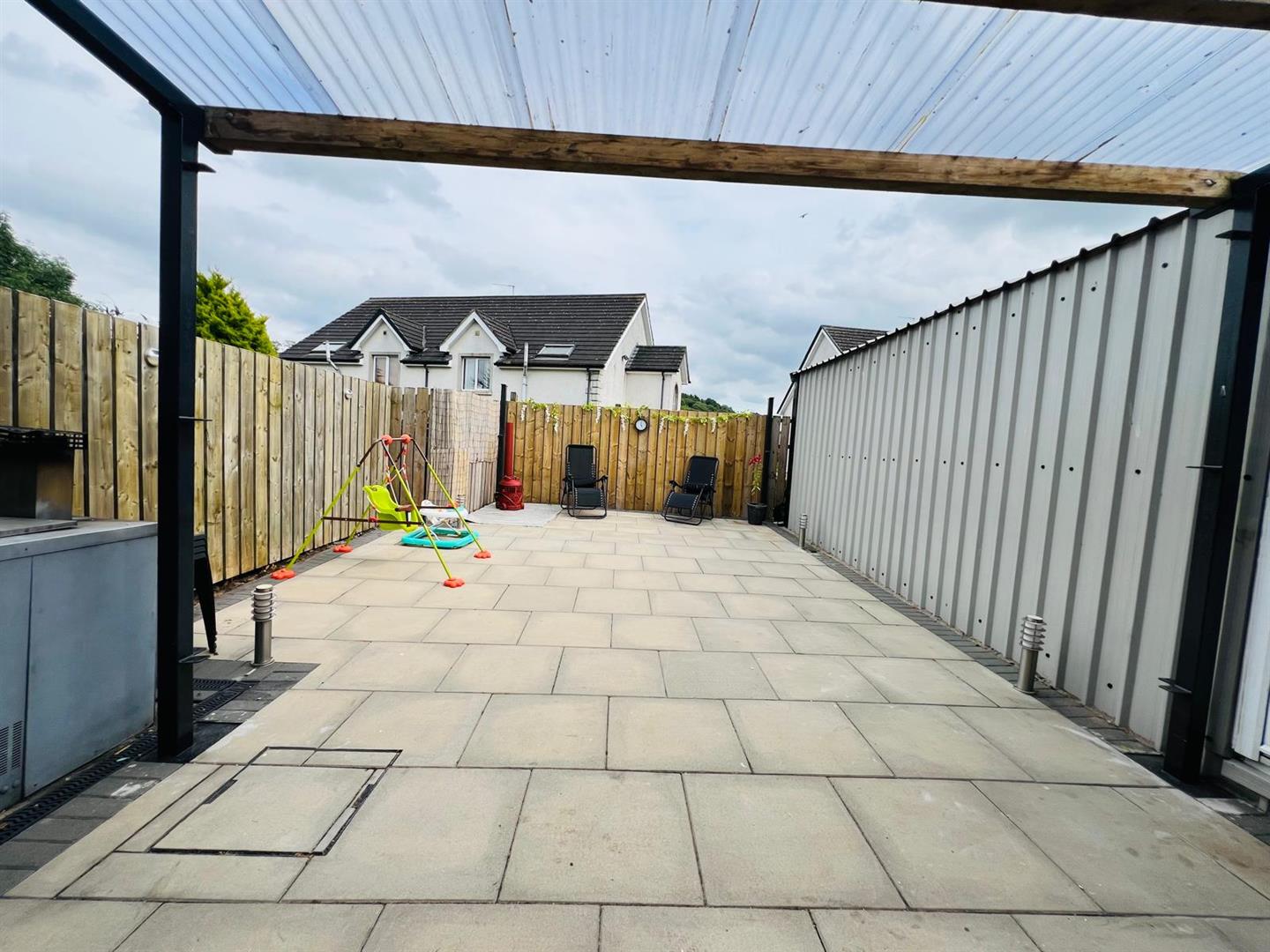 Paved yard to rear enclosed by fence and gate.