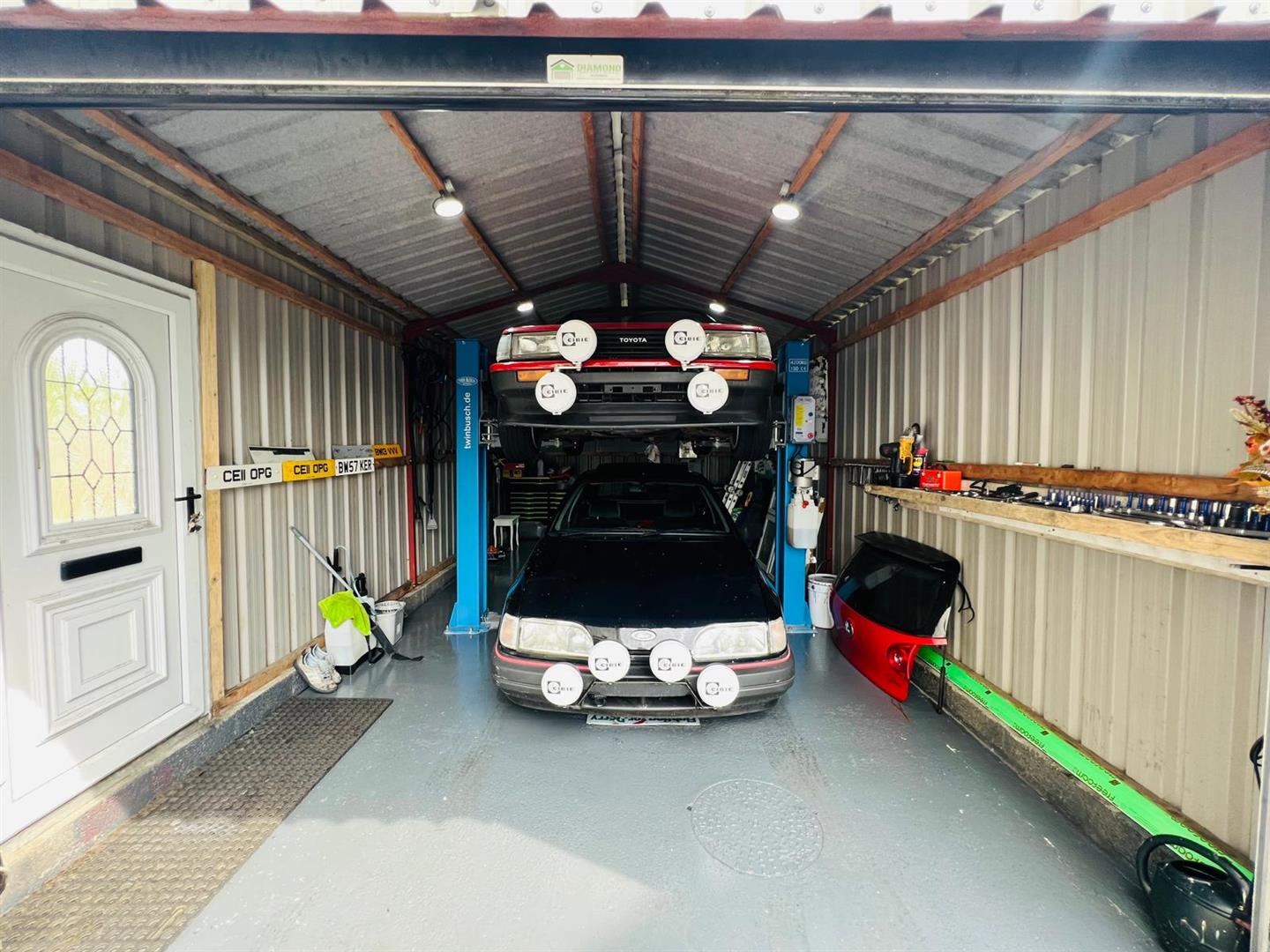 Having roller door, light, side door.