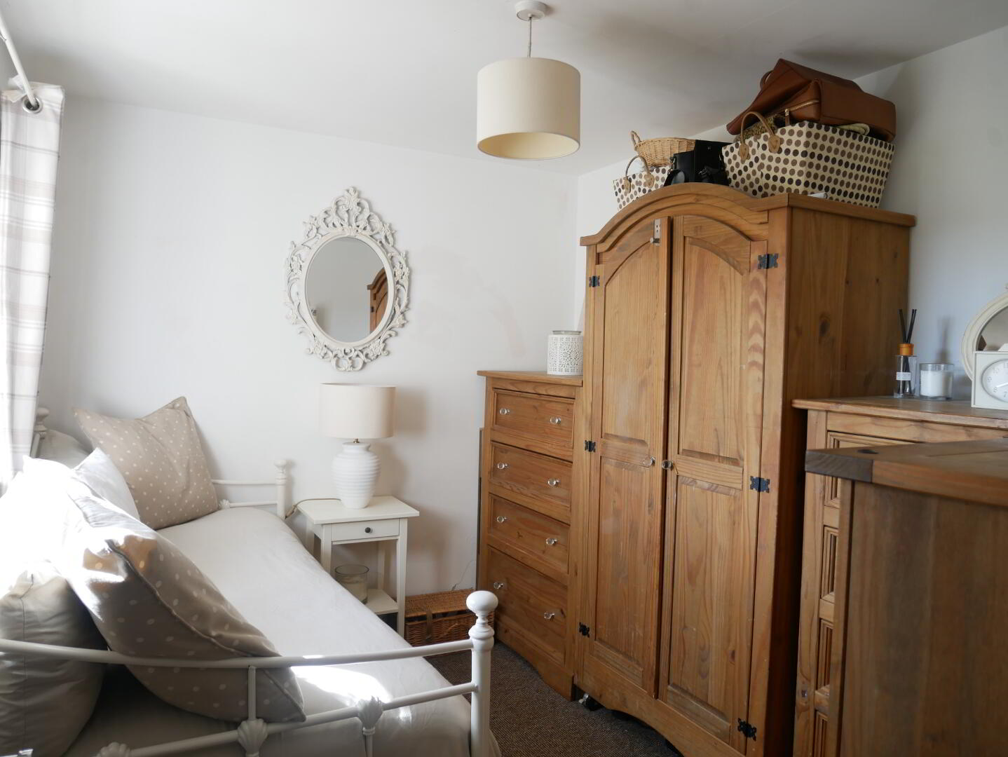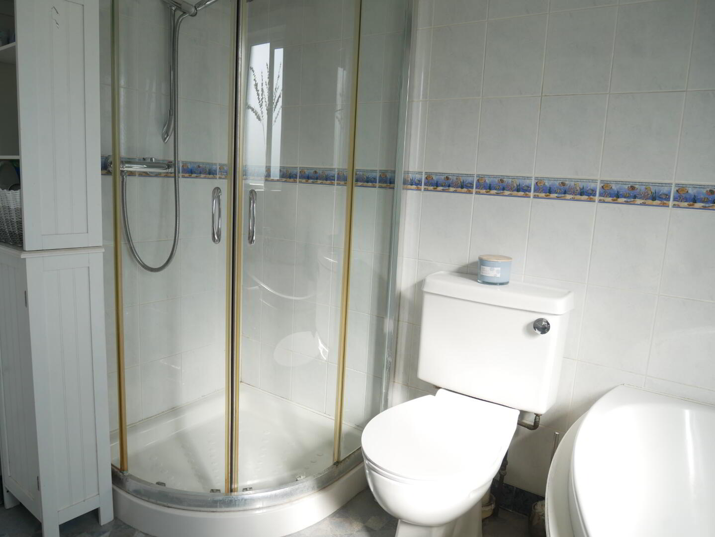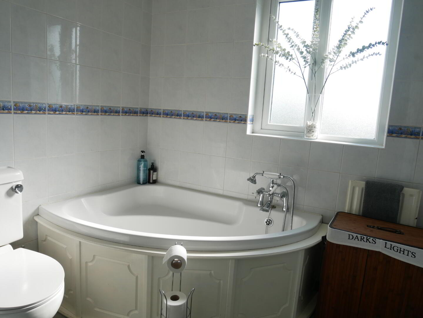 Bathroom: Fully tiled walk in mains shower cubicle, corner bath with tele hand shower attachment, whb with storage, wc, fully tiled walls, cushion flooring, hotpress.