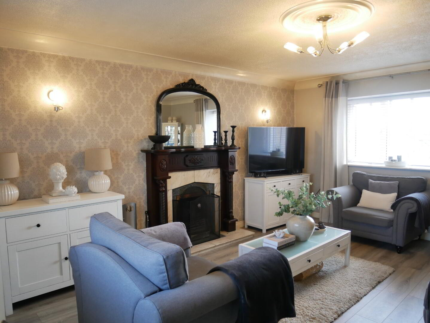 Lounge: 16'5" x 12'7" (to widest points) open fireplace with back boiler, granite inset and hearth, wooden surround, coved ceiling, ceiling centrepiece.