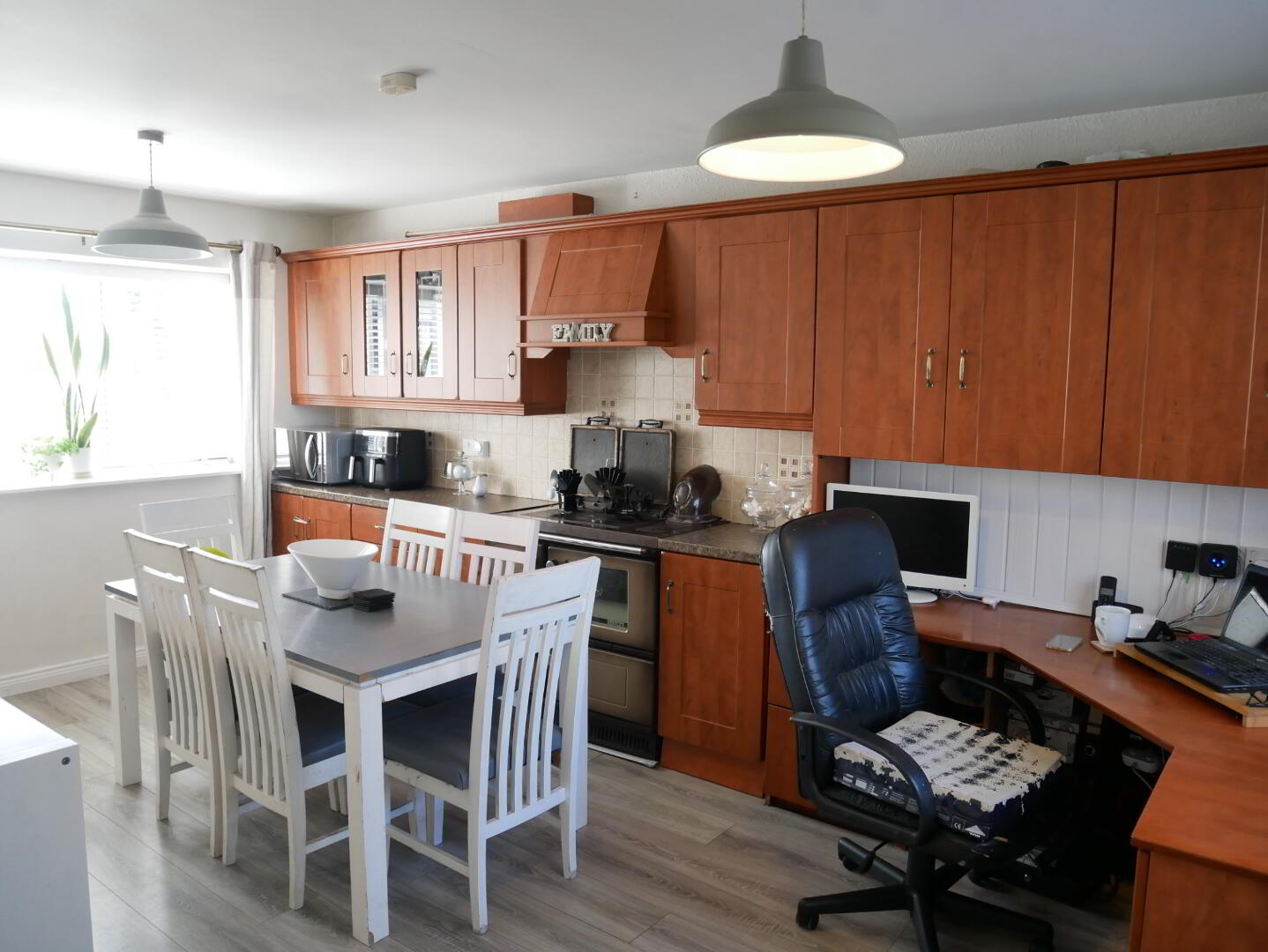 Kitchen/Dining: 16'6" x 10'5" with a selection of eye and low level units, 'Stanley' multi jet oil range with tiled splashback and cooker hood, wood laminate floor.