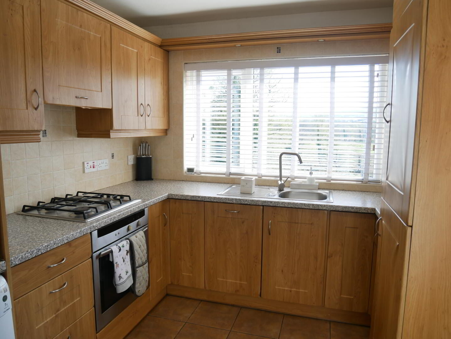 Utility Kitchen: 8'8" x 8'" Fitted with a range of eye and low level units, stainless steel sink unit with mixer tap, built in gas hob, electric oven, tiled around worktops, plumbed for washing machine, space for tumble dryer, tiled floor, integrated fridge freezer, access to rear.