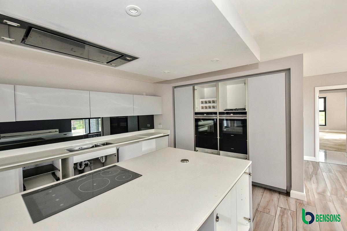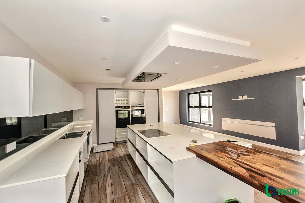 Comprising centre island with integarted hob with extractor fan, breakfast bar, integrated double ovens, walk in larder, recessed lights and tiled floor. Open plan to family area.