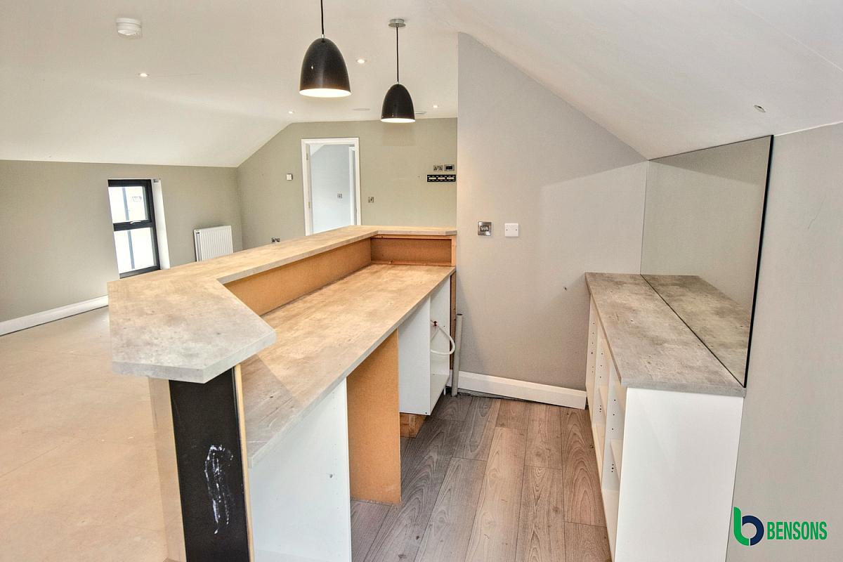 With bar area. Separate doors leading to outside and stairs to rear.