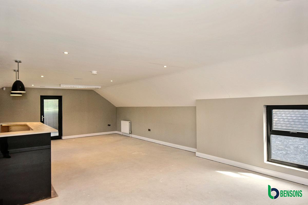 Gallery style landing with recessed lights. Walk in hotpress with storage.
