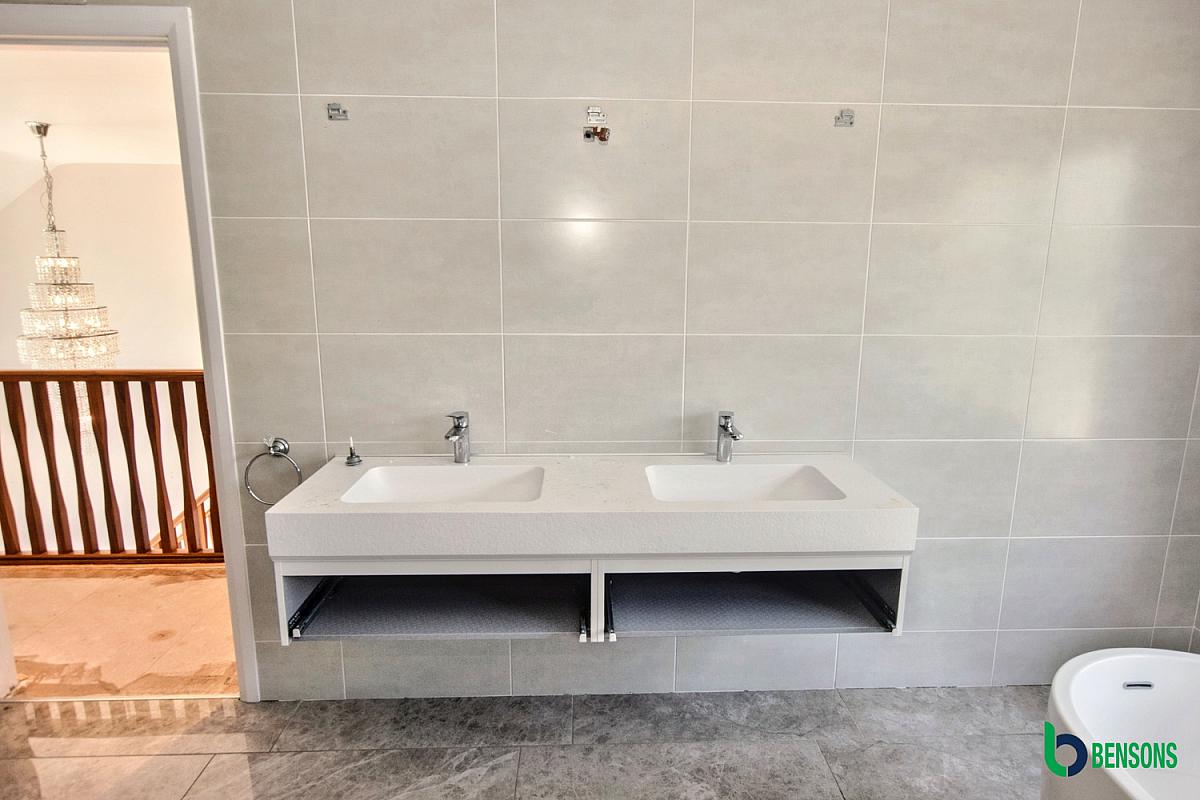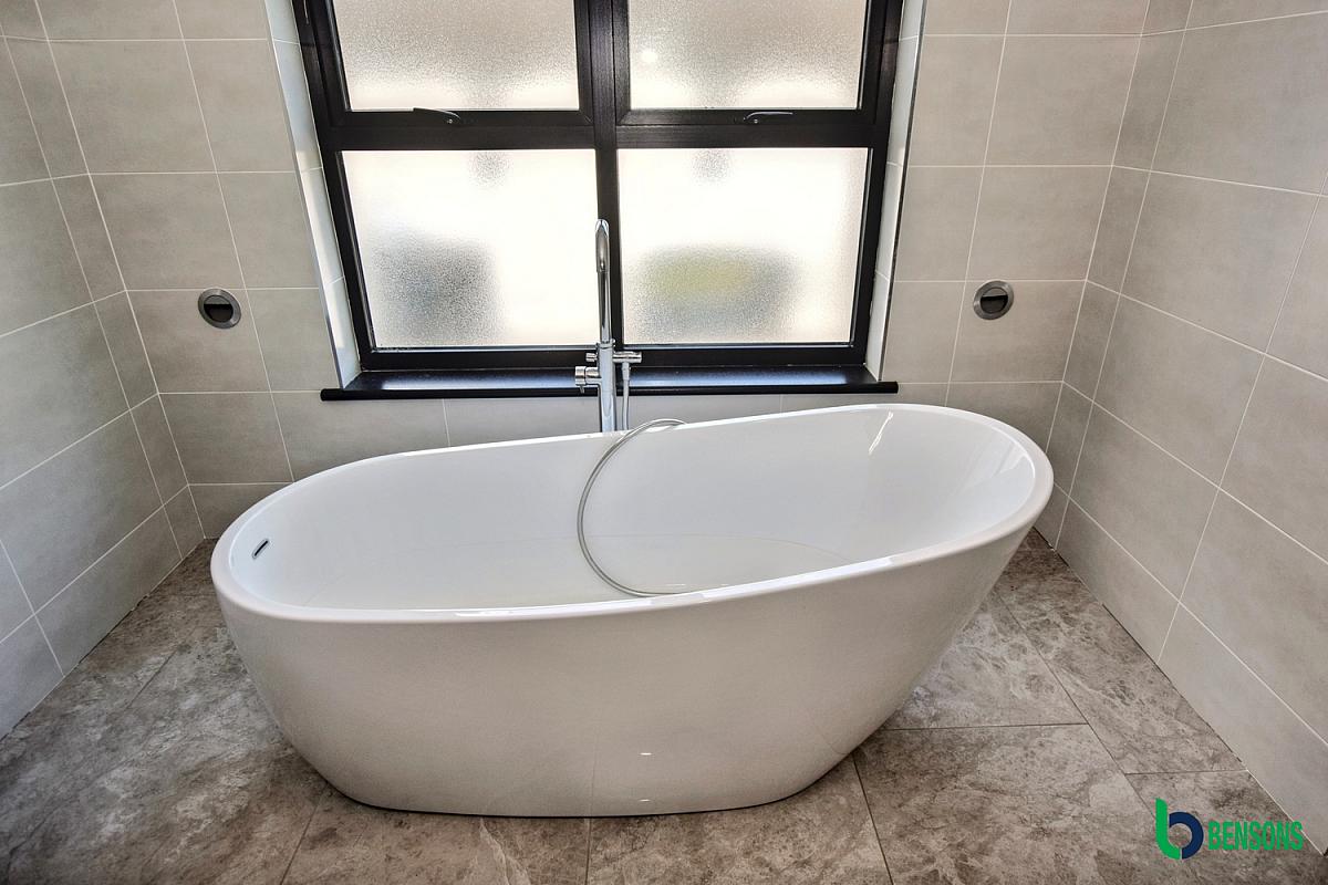 Suite comprising walk in shower cubicle with feature wall and glass panels, dual sink unit, free standing bath, wc, tiled walls and floor.