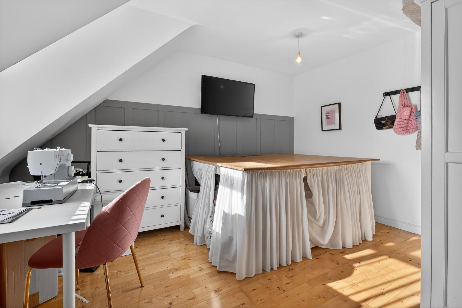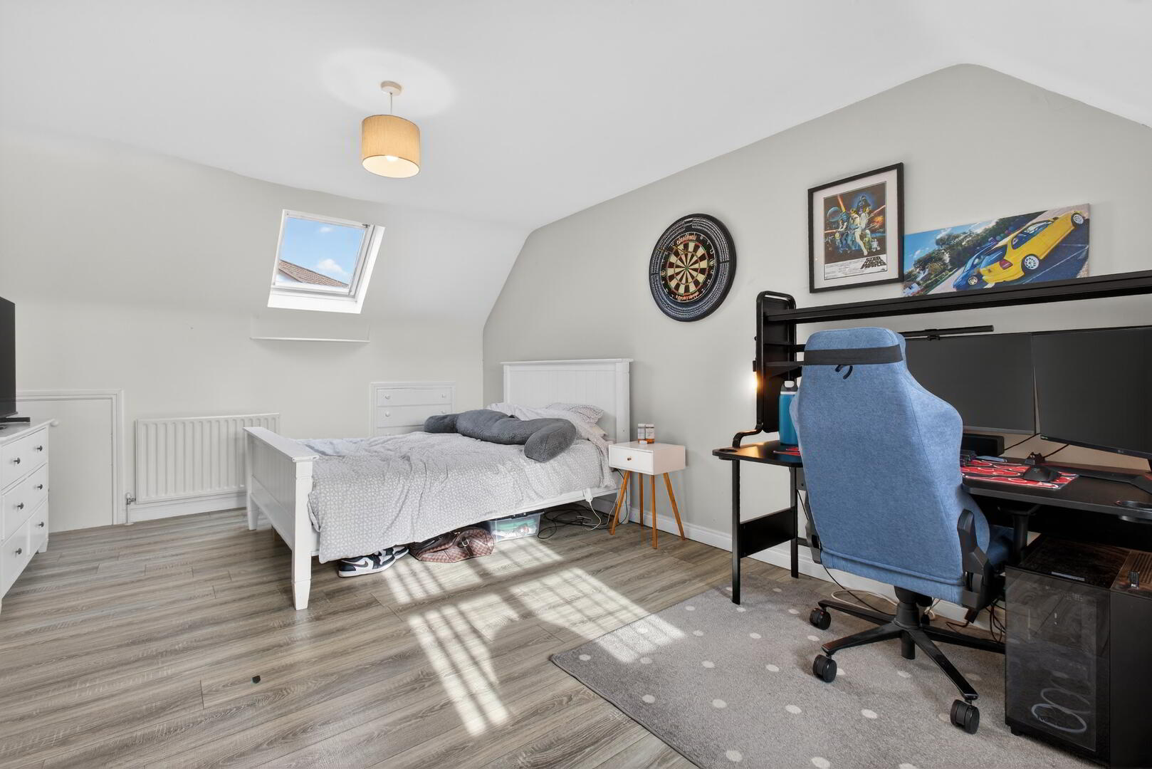 Velux window to rear, uPVC double glazed window to front, radiator, laminated flooring, fitted chest of drawers, access to eaves storage