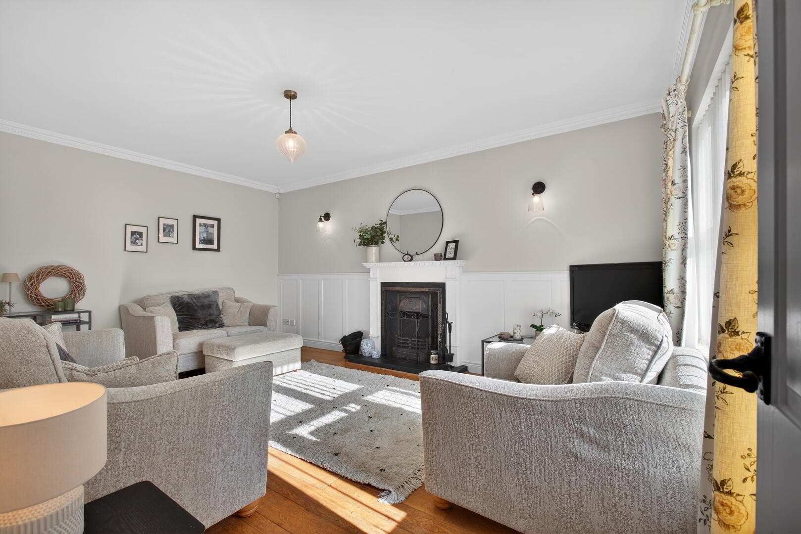 uPVC double glazed window to front, radiator, wooden flooring, cast iron fireplace with tiled hearth, painted surround, coved ceiling and part panelling to one wall