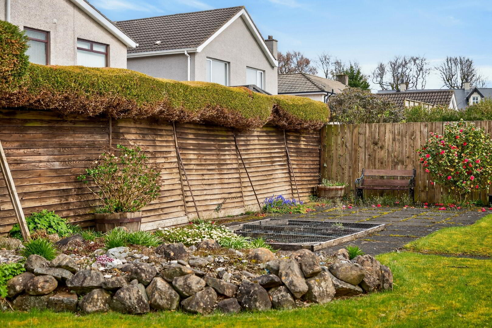 Tarmac driveway providing off street parking and leading to garage, lawned areas either side with flower and shrub beds, access leading to enclosed rear garden (north westerly facing) with lawned area, paved access paths, flower and shrub beds, outside tap, outside lighting
