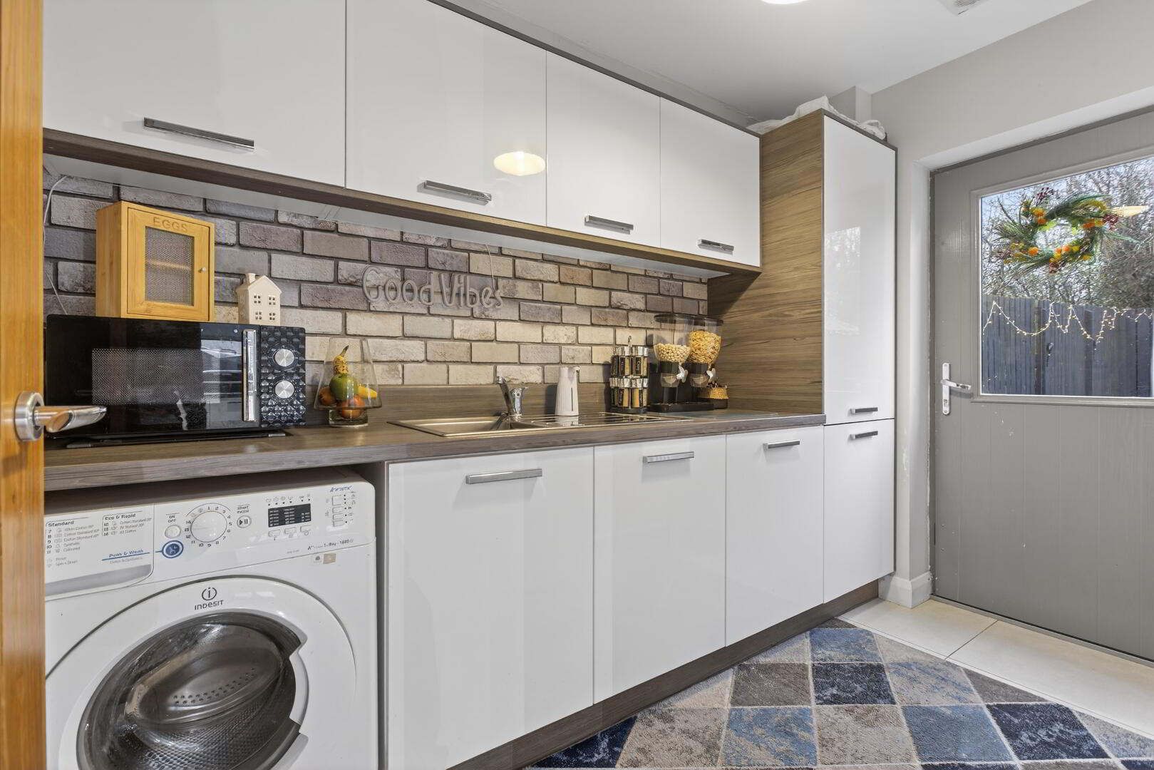 Contemporary eye and low level units, stainless steel sink with mixer tap, plumbed for washing machine, work surface with matching upstand, gas boiler housed in cupboard, tiled flooring, radiator, composite double glazed door to rear