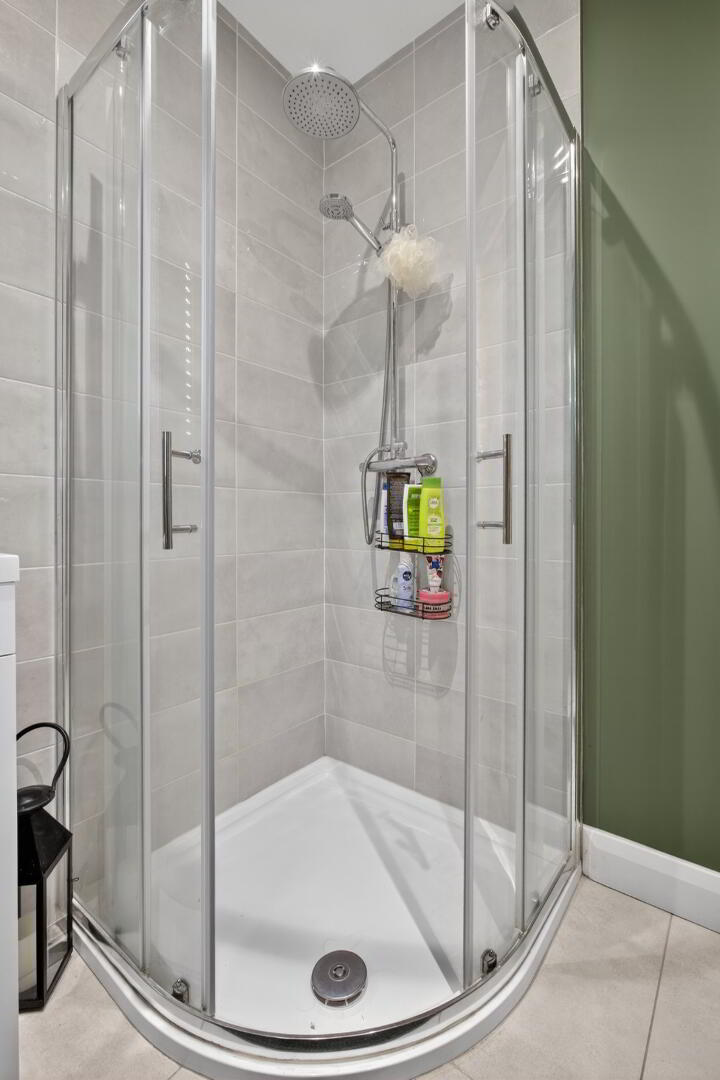 Quadrant shower cubicle with thermostatic handheld and rainfall shower, wash hand basin with mixer tap set on vanity unit, low flush wc, part tiled walls, tiled flooring, chrome radiator towel rail, recessed LED ceiling lighting, uPVC triple glazed window to front