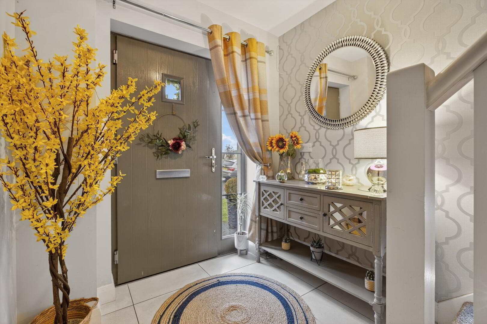 Composite double glazed door to front with double glazed side window, radiator, tiled flooring, under stairs cupboard, staircase to first floor with featurelighting
