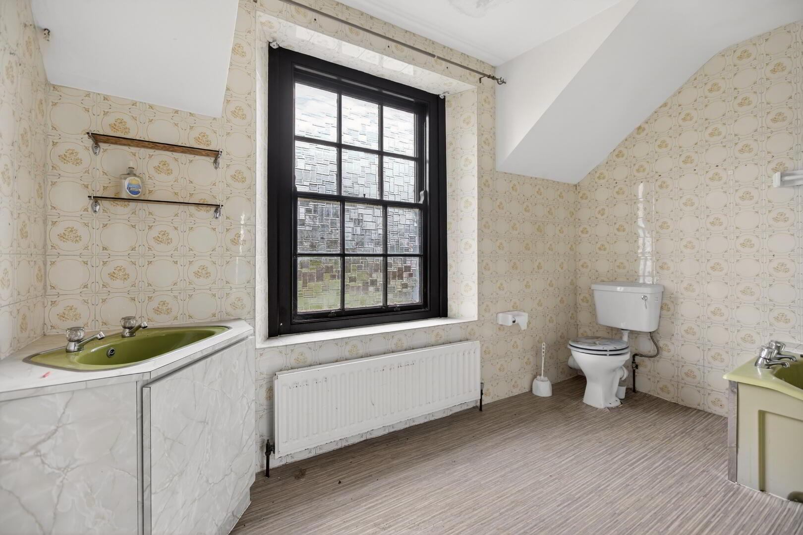 Comprising pedestal wash hand basin and low flush wc, fully tiled walls
