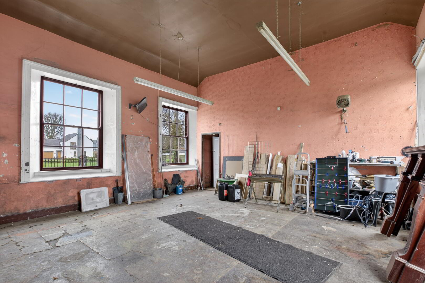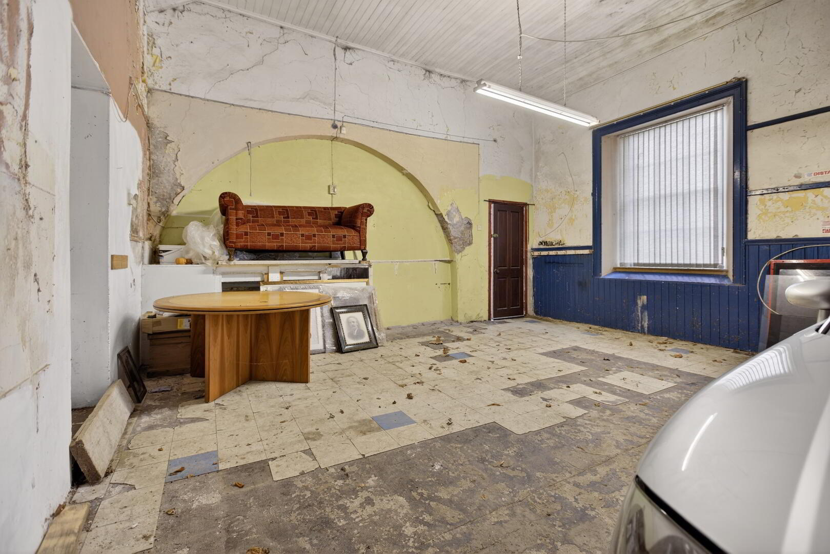 Both the left and right wing of the property which were the original classrooms, feature raised ceiling heights and are spacious in their proportion. The left wing is currently a garage while the right wing is semi partitioned.