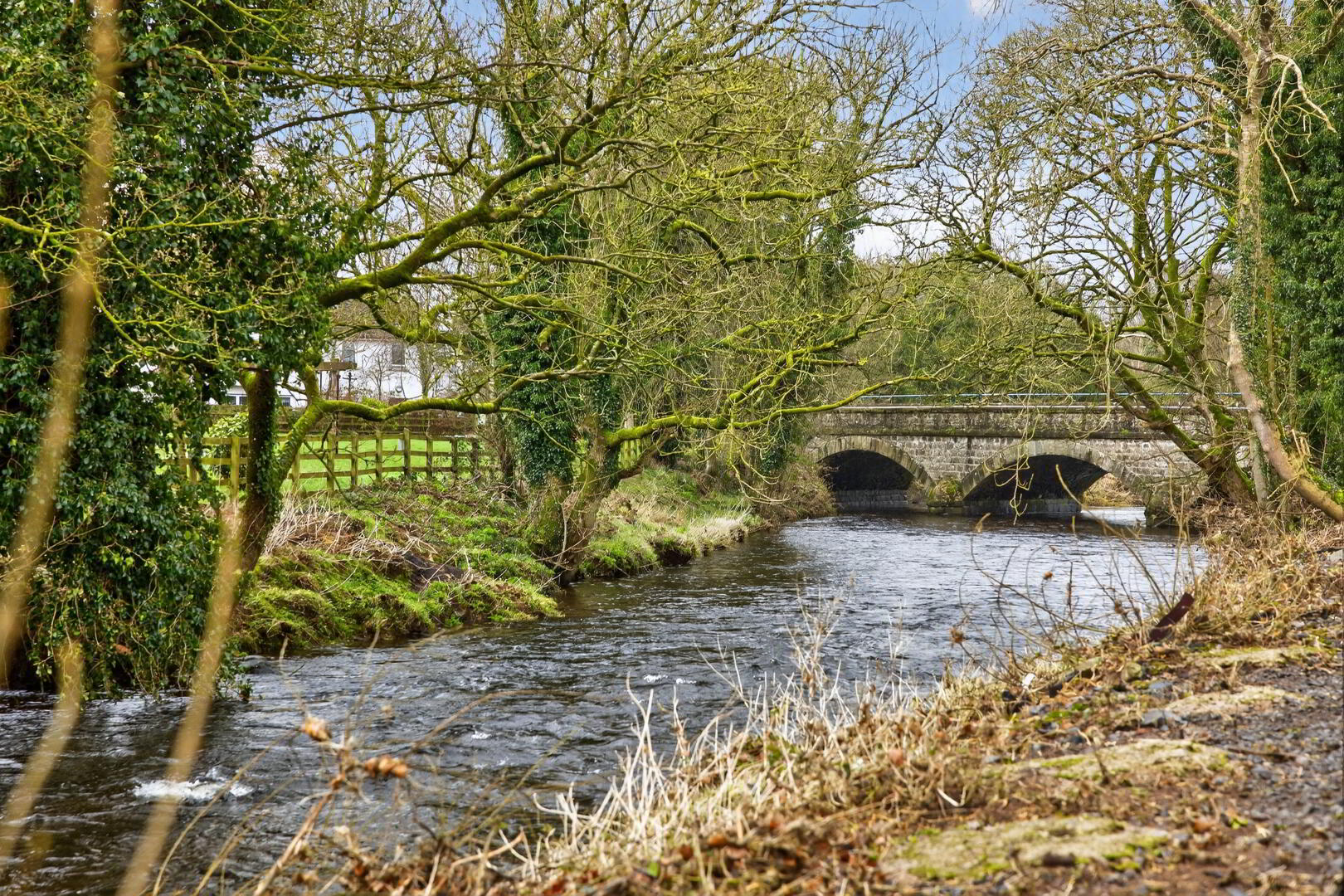 Traditional stone wall and mature trees with the backdrop of the Braid River.